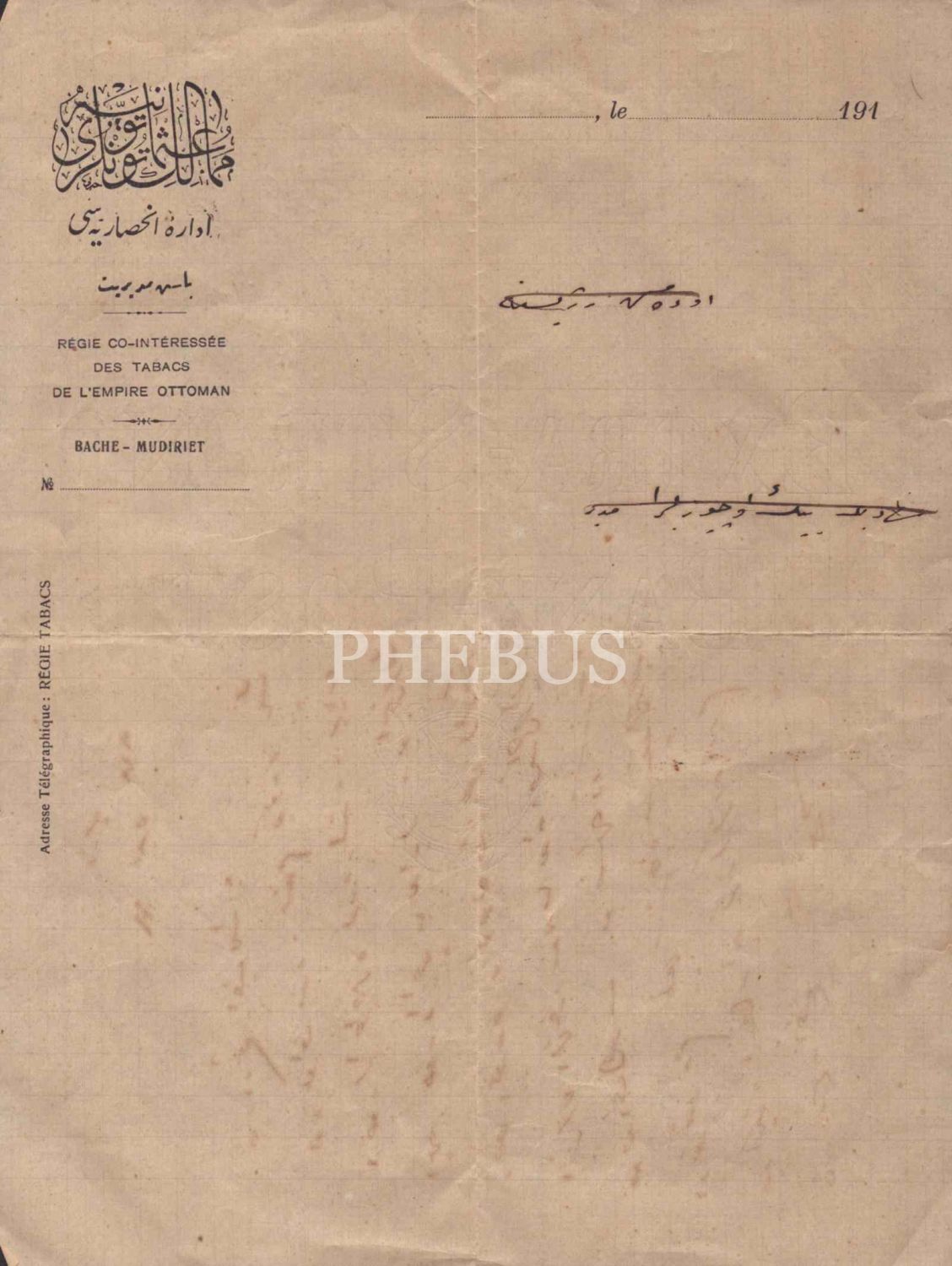 Memalik-i Osmaniye Tütünleri İdare-i İnhisariyesi antetli kâğıt üzerinde kaleme alınan mektup, İzmir 1918, 20x27 cm