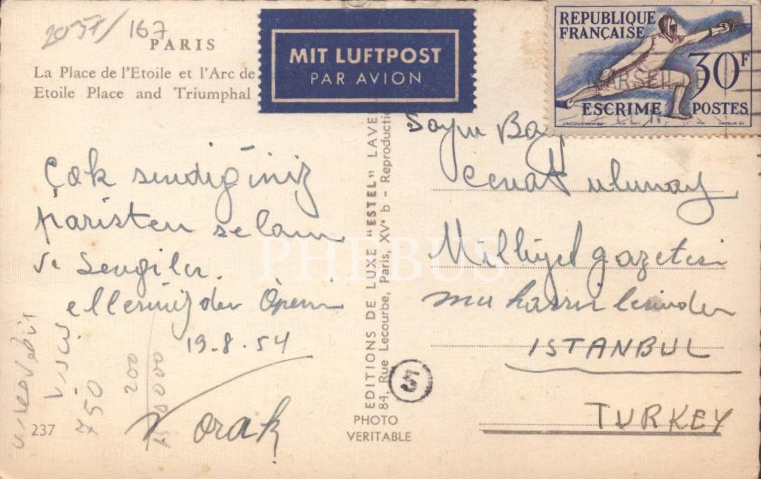 Türk basınının tarihî simalarından gazeteci Refi´ Cevad Ulunay´a gönderilen 19 Ağustos 1954 tarihli Zafer Takı kartpostalı