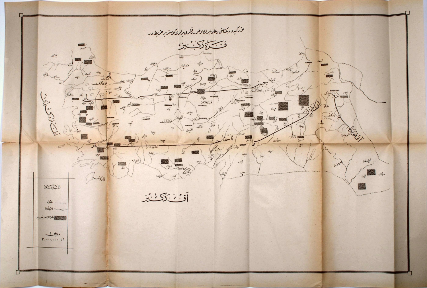 Osmanlıca Türkiye'de Bektaşi ve Alevilerin oturdukları yerleri gösteren harita, 72x50 cm
