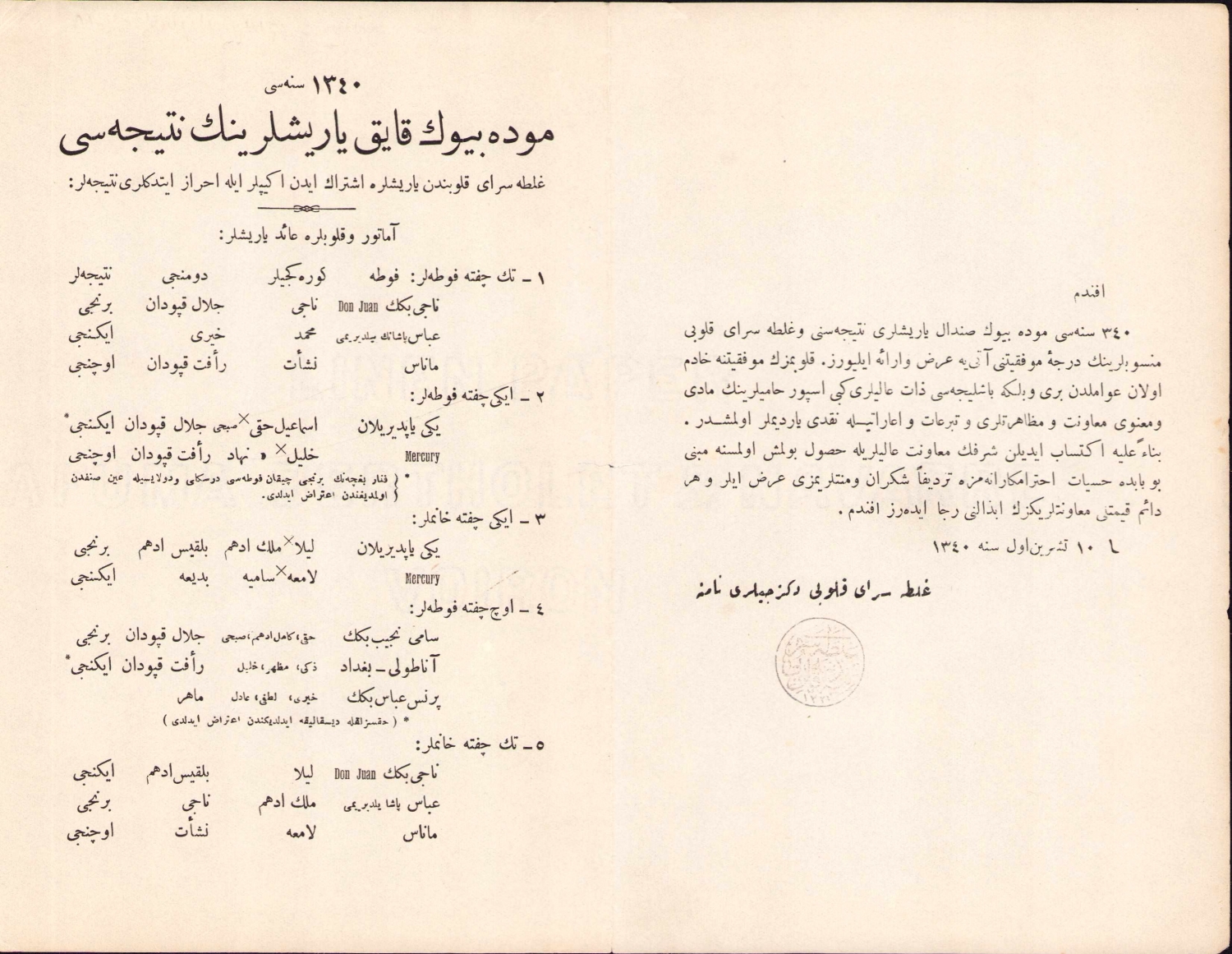 Osmanlıca Moda büyük kayık yarışlarının neticesi: "Galatasaray Kulübünden yarışlara iştirak eden ekipler ile ihraz ettikleri neticelerdir", 28x21 cm