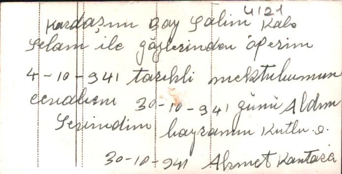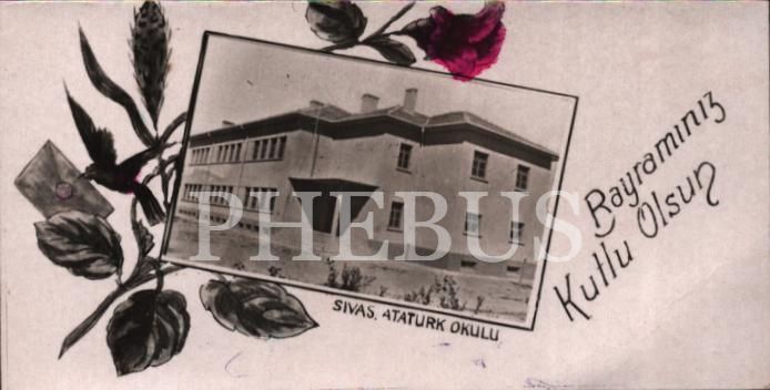 Sivas Atatürk Okulu görselli 1941 tarihli bayram tebrik kartı, 5x9 cm