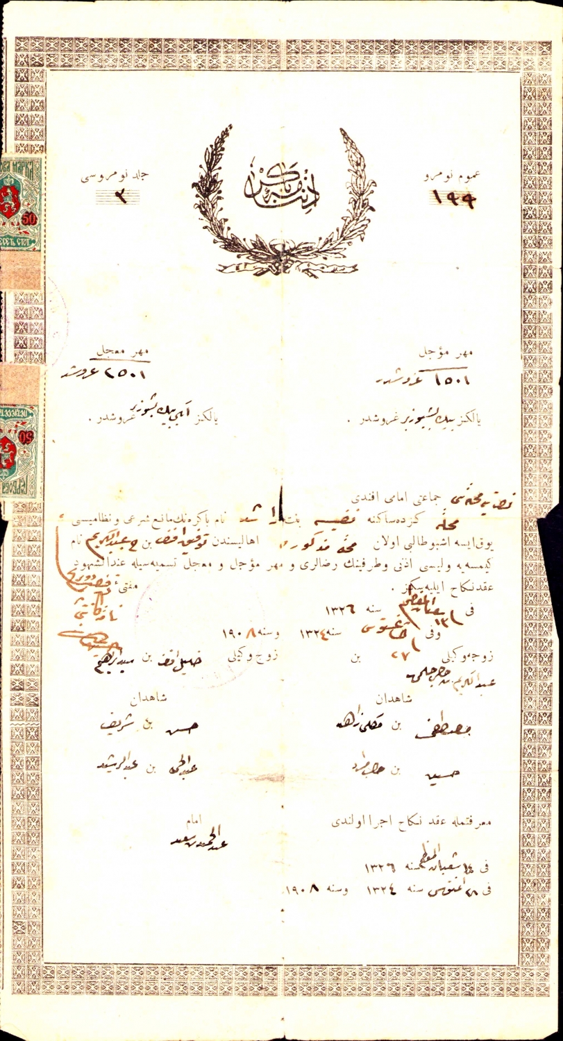 Osmanlıca Bakire İzinnamesi, Ayasofya Camii dersiamlarından Pazarcıklı Hacı Ali Tevfik'in mahdumuna ait nikah akdi, 1908, 16x30 cm