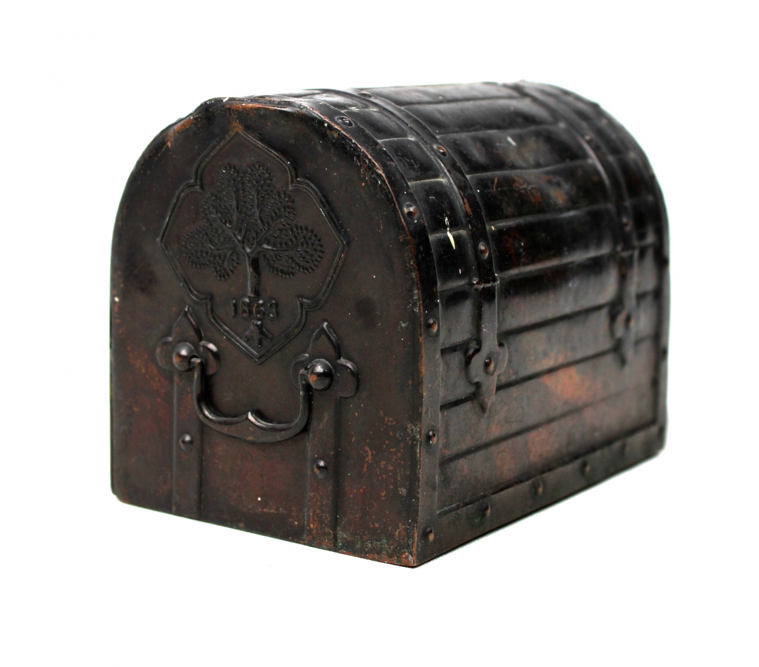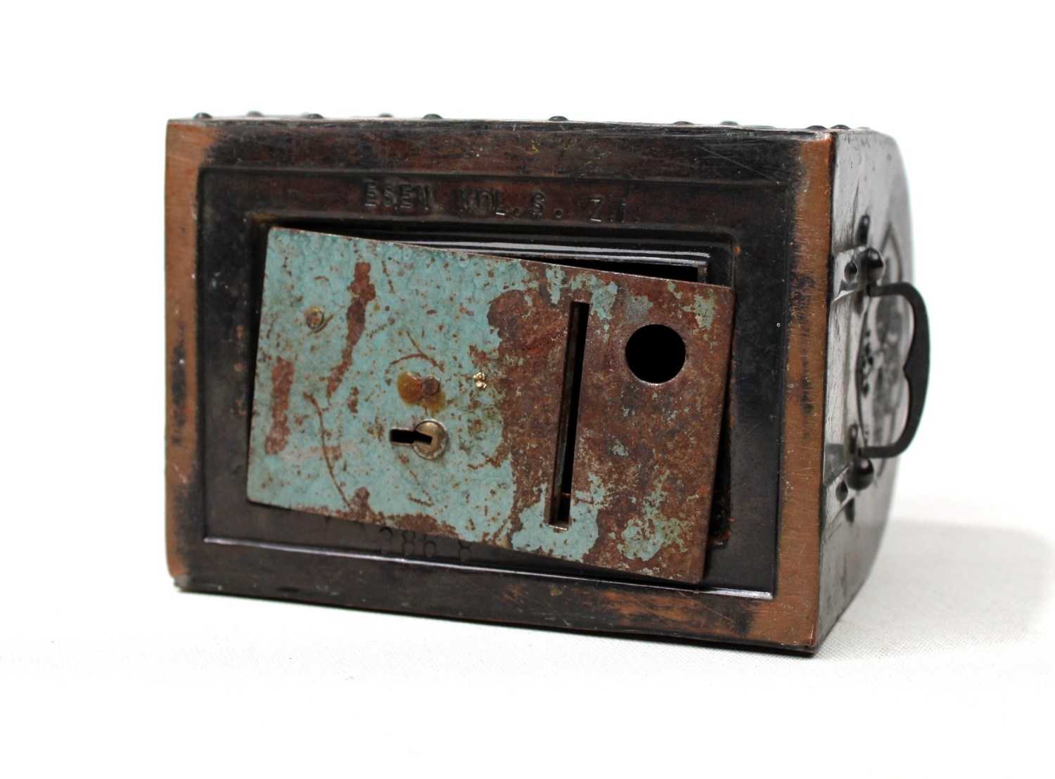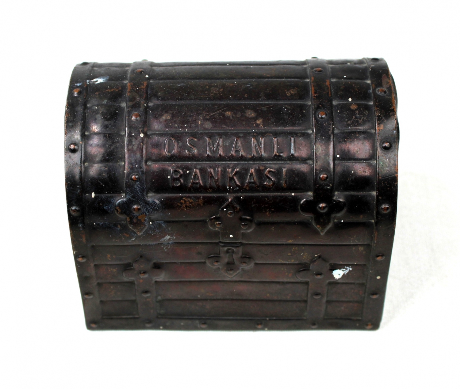Osmanlı Bankası sandık formunda teneke kumbara, 11x9x8 cm.