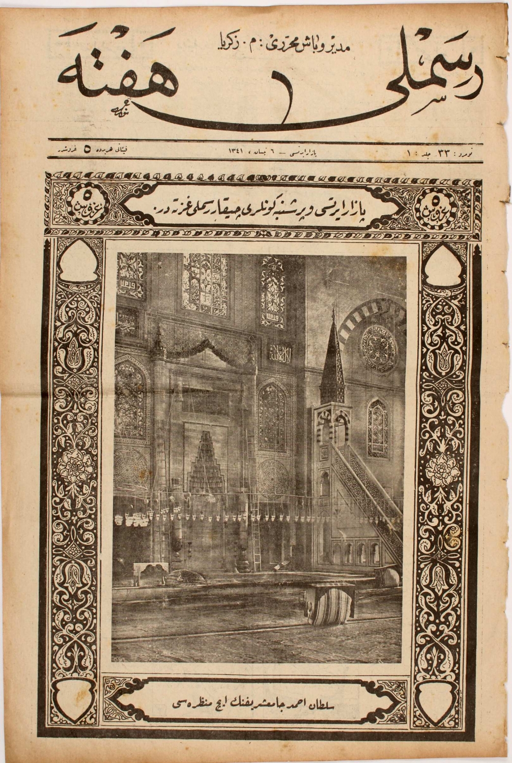 Osmanlıca Resimli Hafta, hicri 1341 tarihli, "Sultan Ahmet Camiinin iç manzarası", 8 sayfa, 29x45 cm