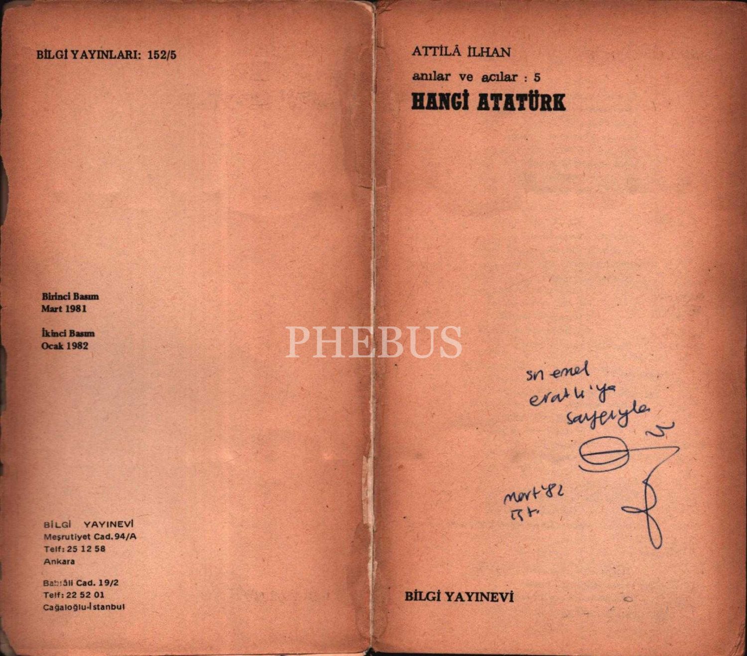 HANGİ ATATÜRK, Attila İlhan, 1982, Bilgi Yayınevi, 330 sayfa, 11x19 cmİTHAFLI VE İMZALI...