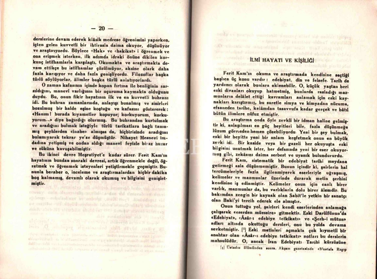 Edebiyat tarihçiliği ve dilciliği yanı sıra, biyografi çalışmalarıyla da Türk edebiyatına büyük katkılar sağlamış olan Prof. Agâh Sırrı Levend´in (1894 - 1978); klasik Türk ve Fars edebiyatları üzerine yaptığı incelemelerle tanınan Prof. Ferid Kam (1864 - 1944) biyografisi... Çeşitli kabinelerde Dışişleri, Milli Eğitim, Maliye, Adalet bakanlıkları, 1942 - 1946 yılları arasında başbakanlık yapmış, 1934 - 1950 yılları arasında FB Kulübü başkanlığını yürütmüş olan siyasetçi Şükrü Saraçoğlu´na (1886 - 1953) imzalı... Döneminde yapılmış, usta işi, siyah bez cildi içinde...