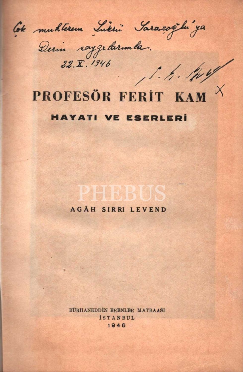 PROFESÖR FERİT KAM HAYATI VE ESERLERİ, Agâh Sırrı Levend, İstanbul 1946, Bürhaneddin Erenler Matbaası, 160 sayfa, 14x21 cm ŞÜKRÜ SARAÇOĞLU´NA İMZALI…