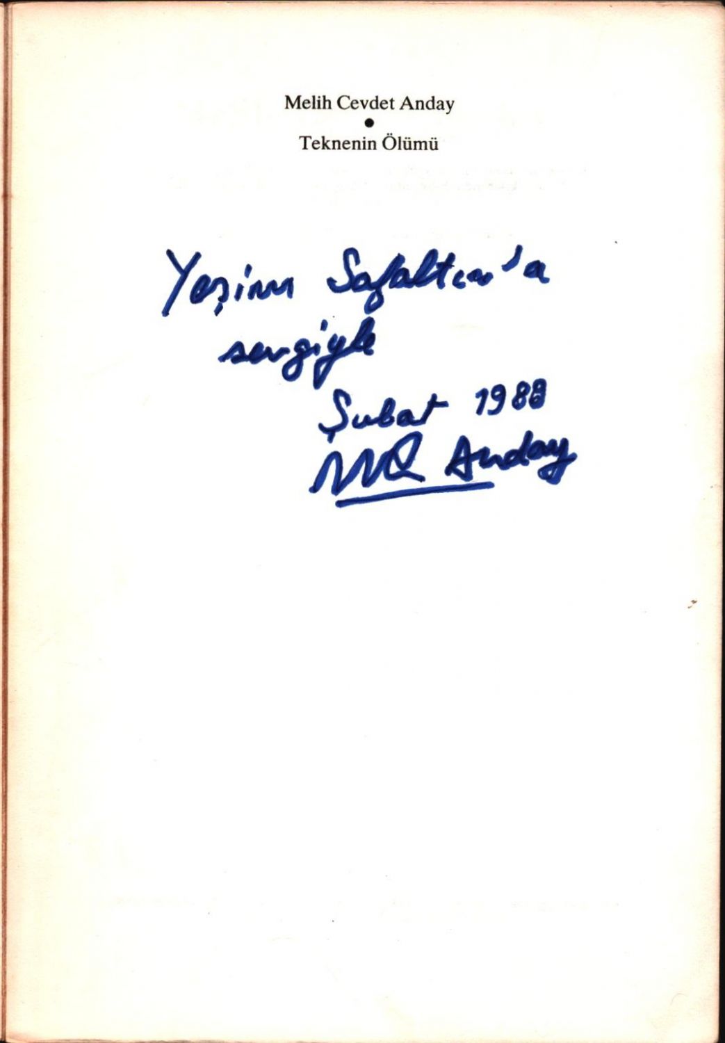 TEKNENİN ÖLÜMÜ, Melih Cevdet Anday, 1985, Adam Yayınları, 90 sayfa, 13,5x19,5 cm İTHAFLI VE İMZALI…