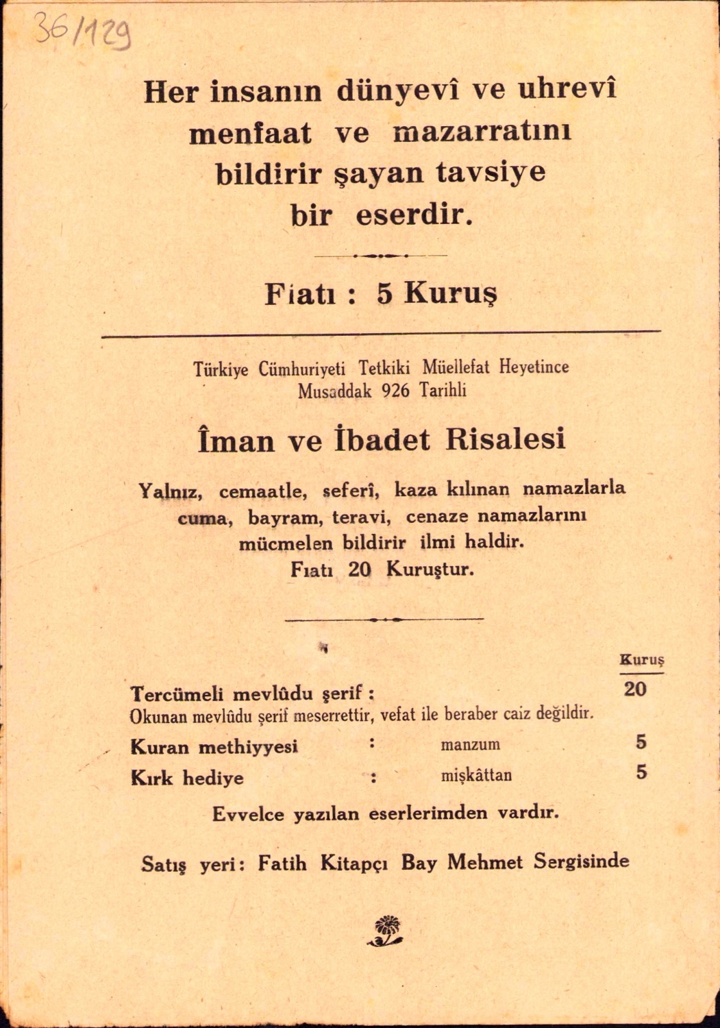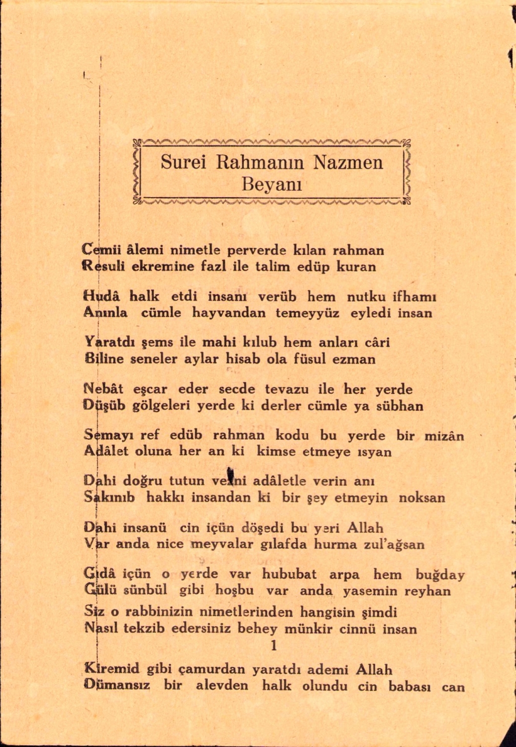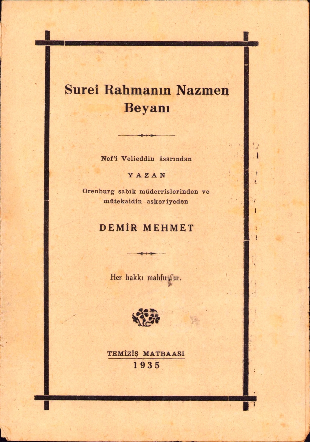 Surei Rahmanın Nazmen Beyanı, Nefi Velieddin asarından Demir Mehmet, Temiziş Matbaası, 1935, sırtı haliyle, 7 sayfa, 14x20 cm