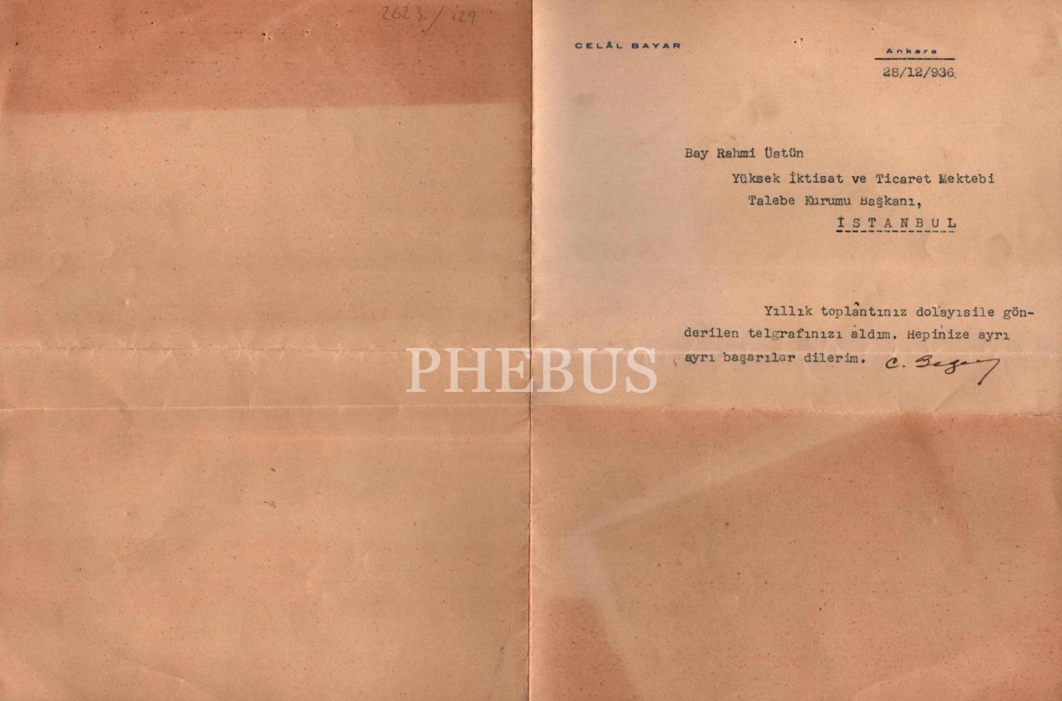 CELAL BAYAR ıslak imzalı, 1936 tarihli cevabî mektup, 17x23 cm