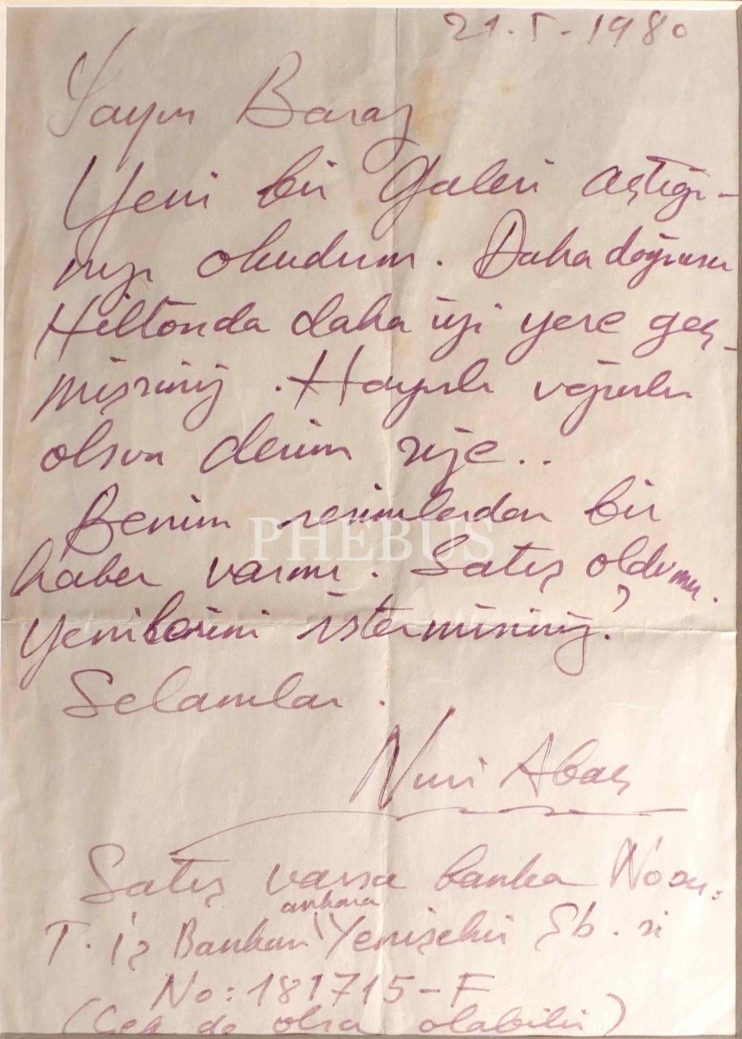 RESSAM NURİ ABAÇ´tan Galeri Baraz´ın kurucusu YAHŞİ BARAZ´a yazılmış mektup, 16x21 cm