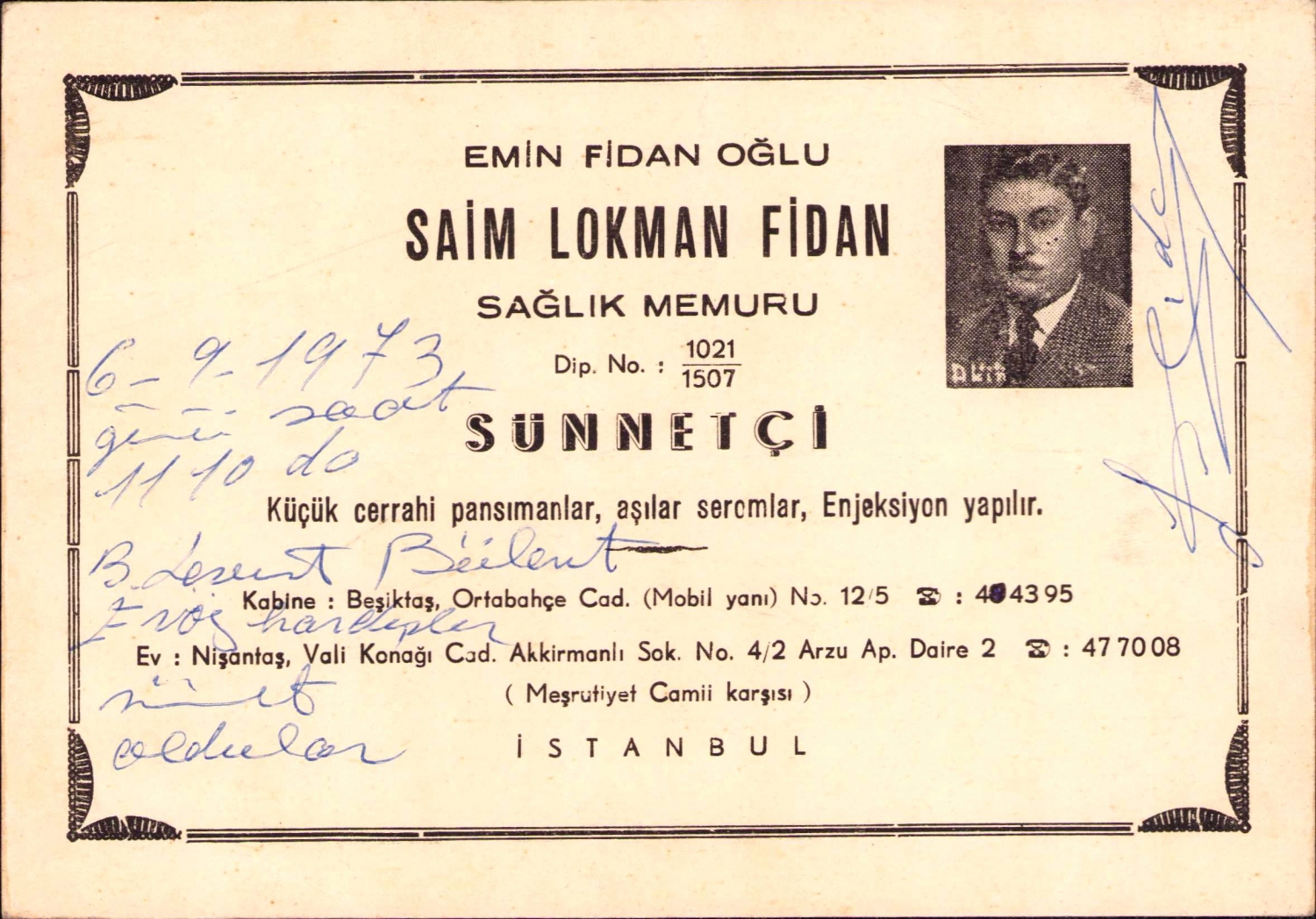 Emin Fidan Oğlu Saim Lokman Fidan Sağlık Memuruna ait reklam kartoneti, ortadan kırık, 20x14 cm