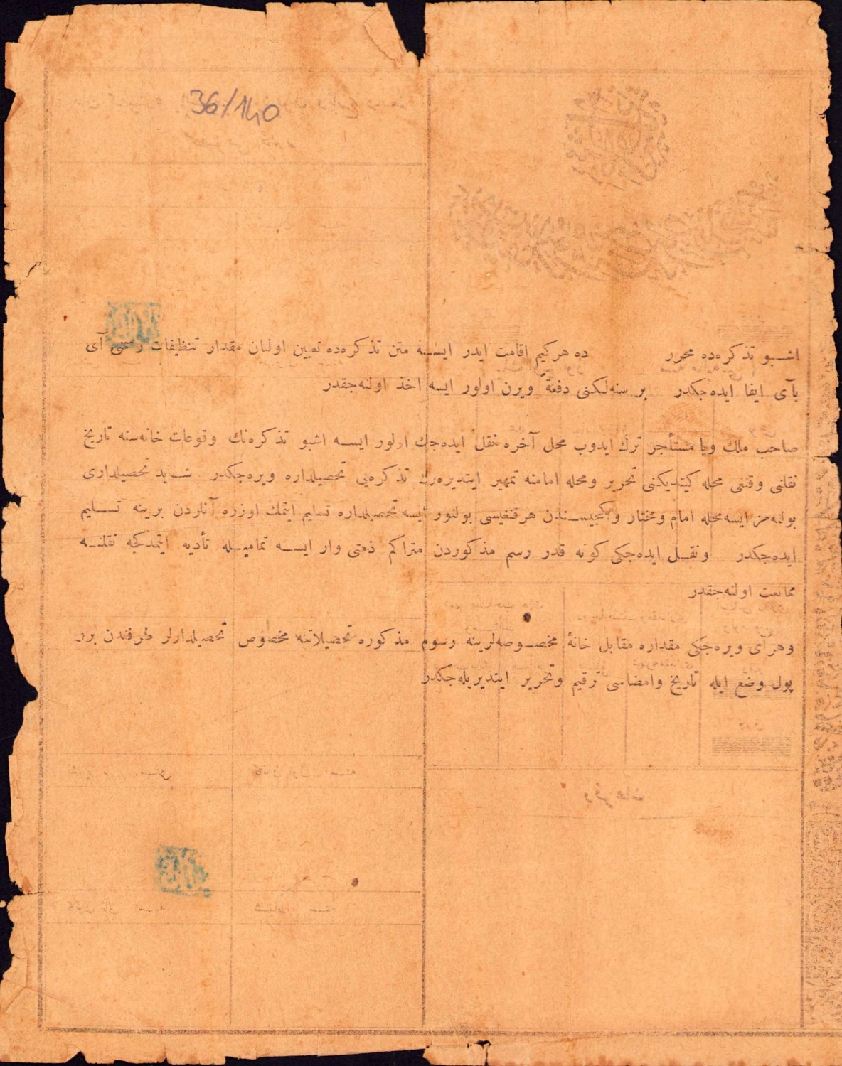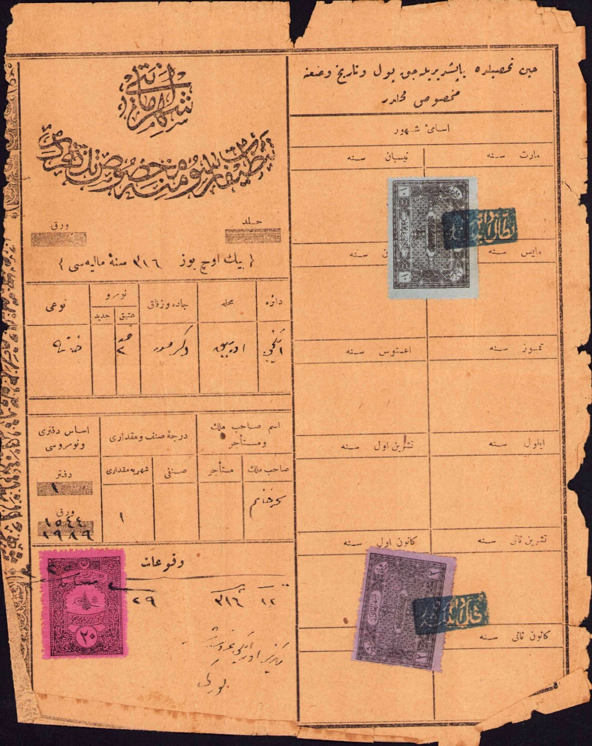 Osmanlıca evrak, Şehremaneti tanzifat-ı rüsuma mahsus tezkere (temizlik vergisi), 19x25 cm
