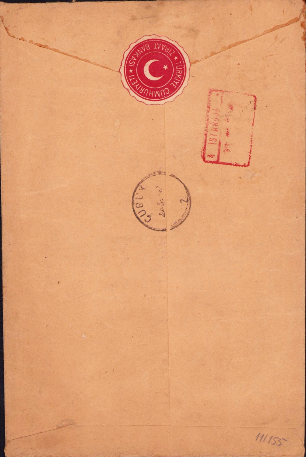 Ziraat Bankası antetli, Galata taahhüt pullu, Ziraat Bankası kapama vinyetli, büyük boy zarf