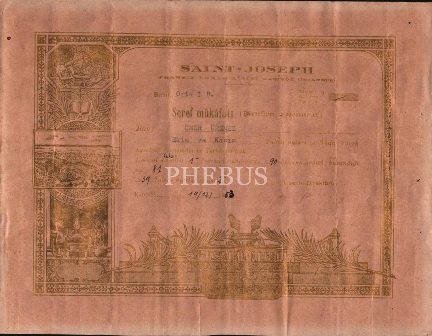 Saint Joseph Lisesi onur belgesi, 19 Aralık 1953, 20x26 cm