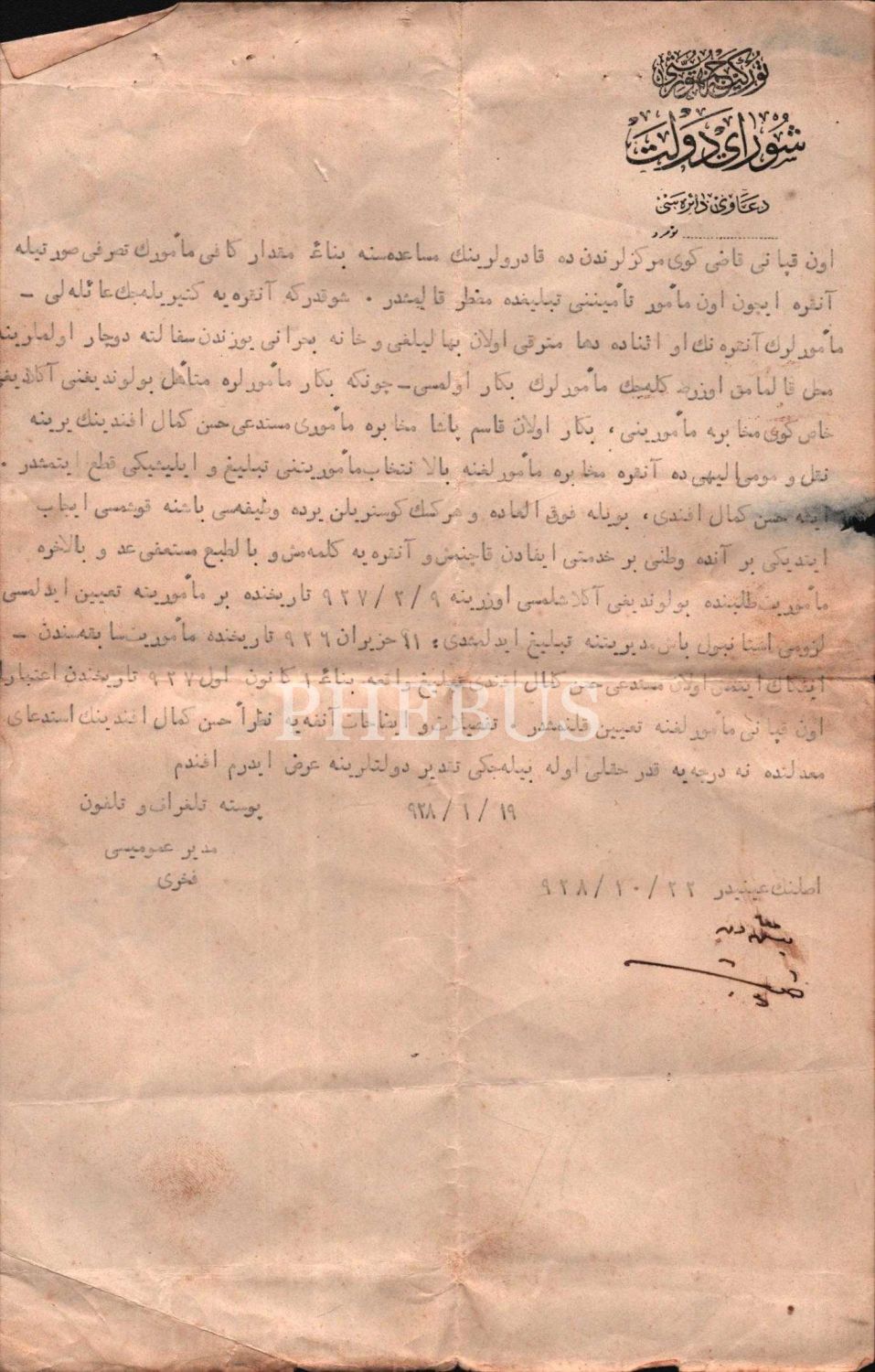 T.C. Şurâ-yı Devlet antetli, Hasan Kemal´in memurluğuna ilişkin 1928 tarihli belge, 17x27 cm