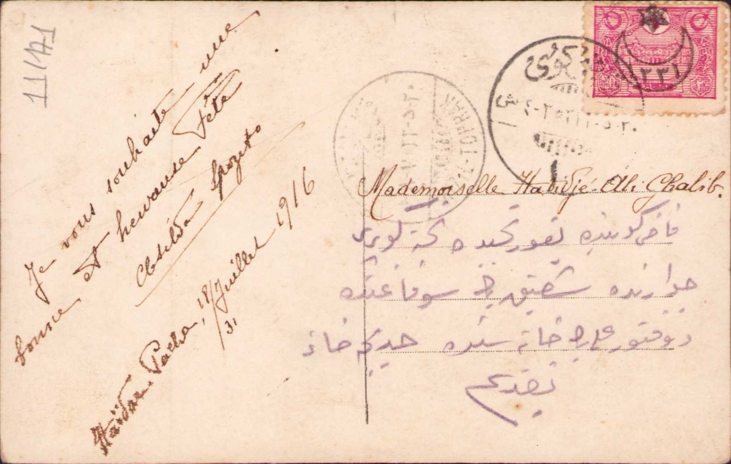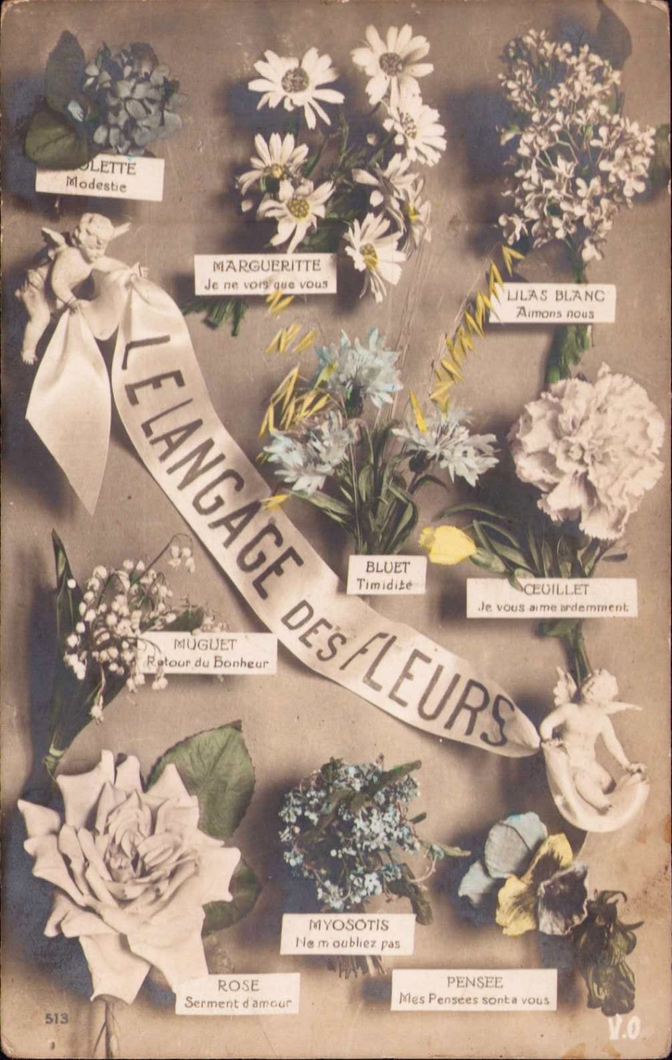 "Çiçeklerin dili" fransızca kartpostal, postadan geçmiş, 1916 Haydarpaşa adresli, Ali Galip Beye gönderilmiş Osmanlıca Kadıköy damgalı pullu.