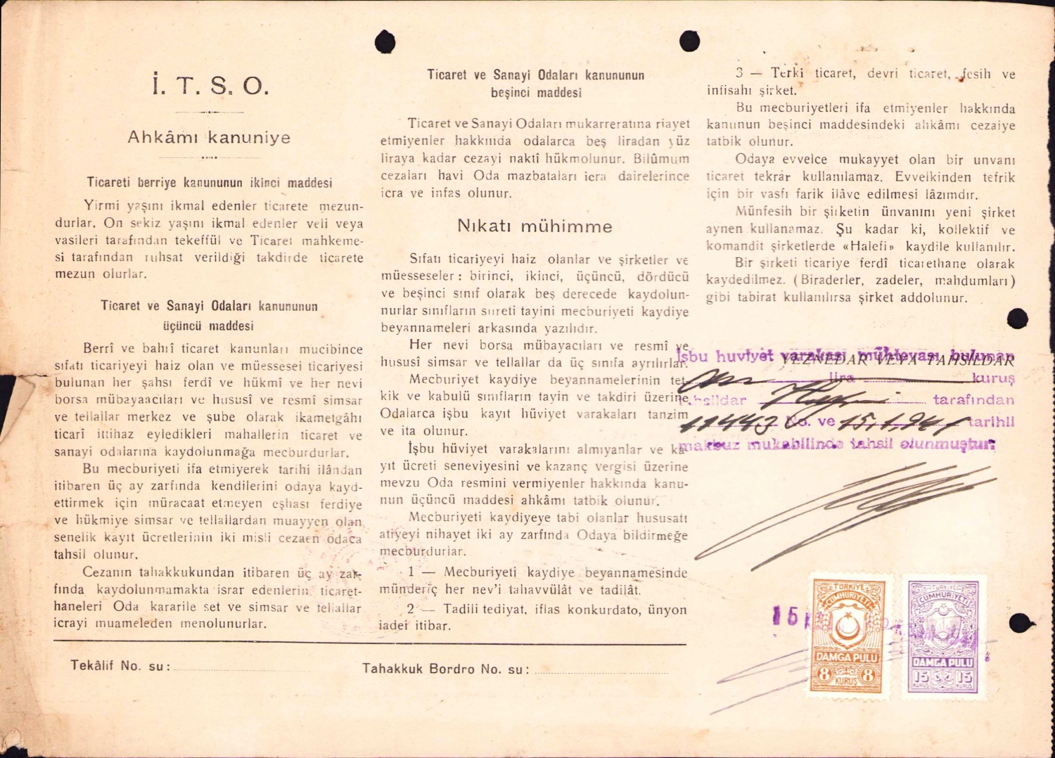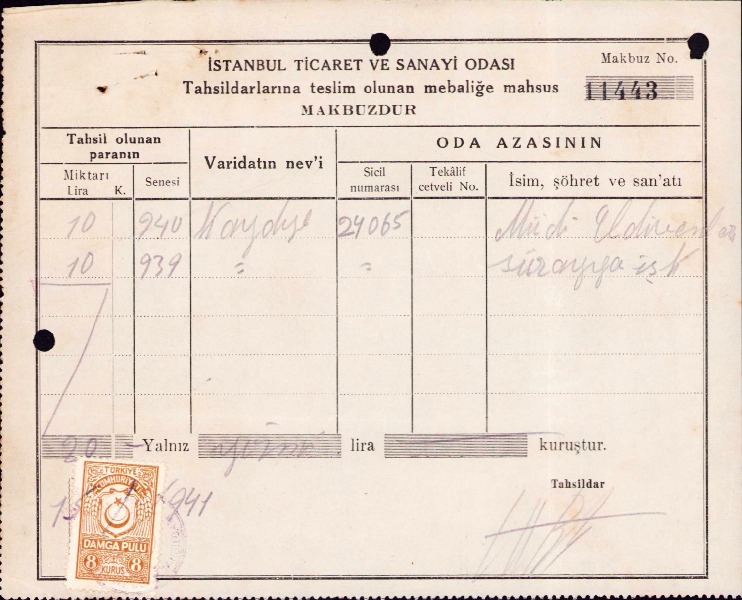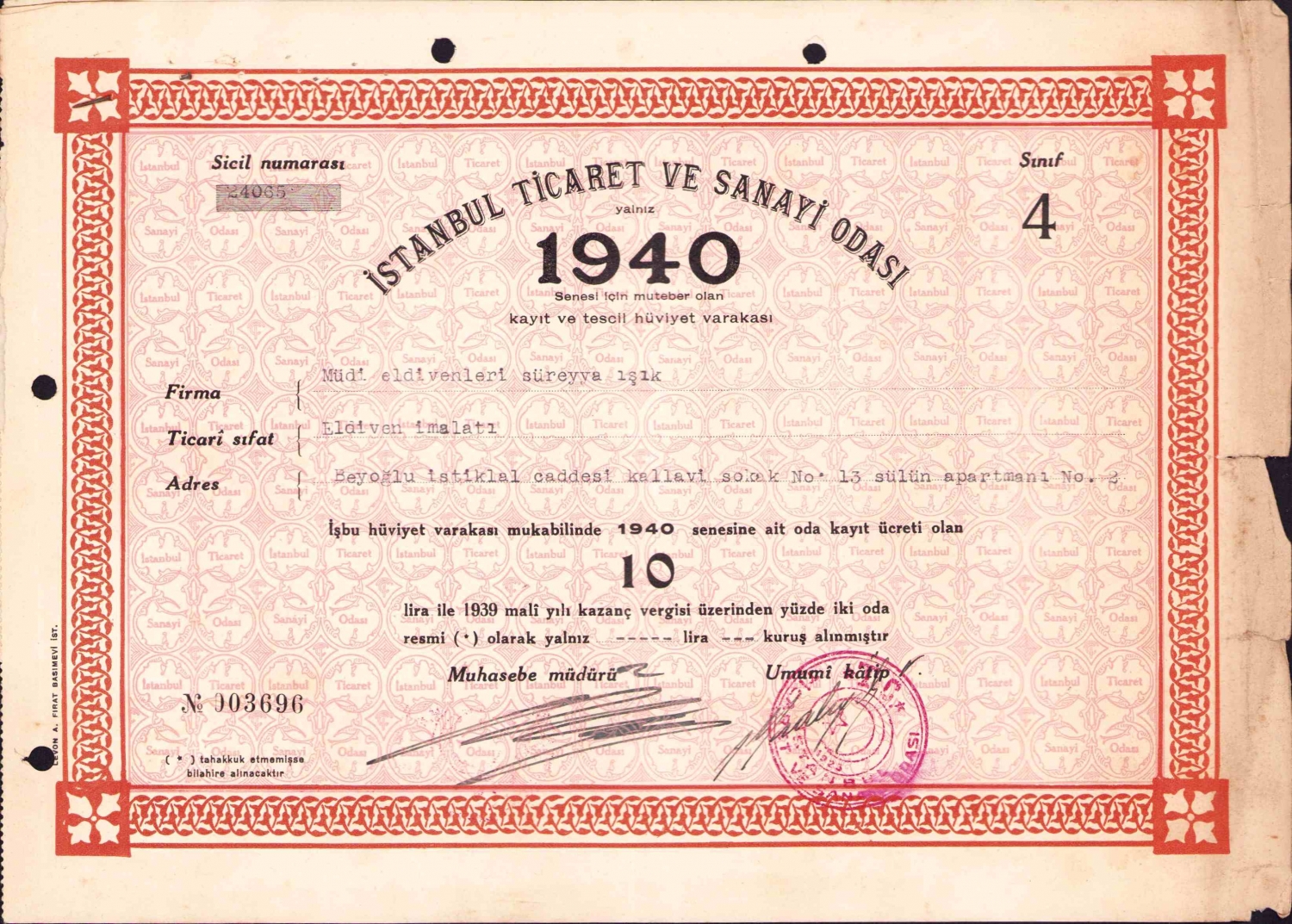 İstanbul Ticaret ve Sanayi Odası "eldiven imalatı" 1940 tarihli hüviyet varakası