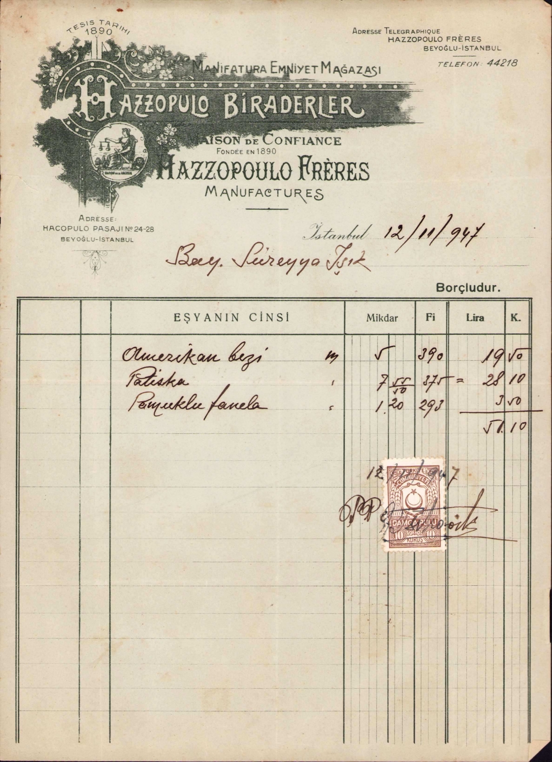 Beyoğlu Hazzopoulo Freres 2 dilde antetli 1947 tarihli fatura, 20x28 cm