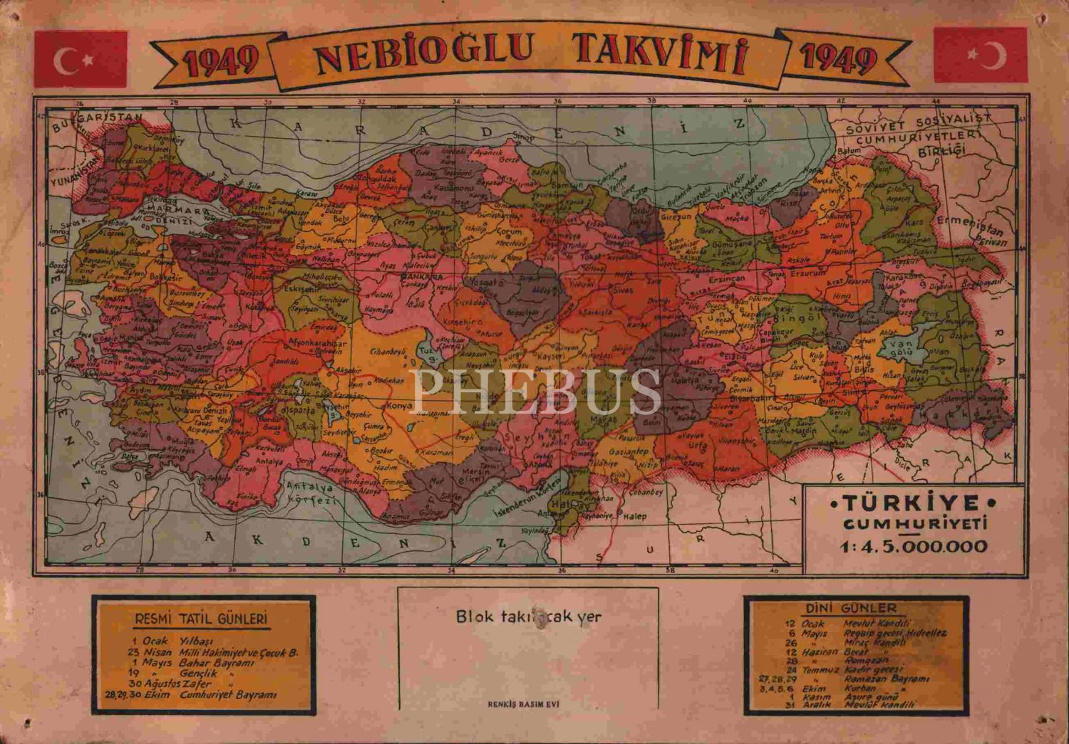 Nebioğlu Yayınlarının Türkiye Haritası görselli 1949 yılı takvim kartoneti, Renkiş Basımevi, 23x33 cm