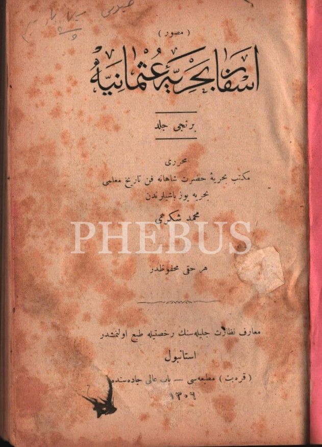 Osmanlı armalı ve ay yıldızlı cildinde MUSAVVER ESFÂR-I BAHRİYYE-İ OSMÂNİYYE [Osmanlı Deniz Seferleri] (1. Cilt), Mehmed Şükrü, Karabet Matbaası, İstanbul 1306, 501 s., 14x20 cm