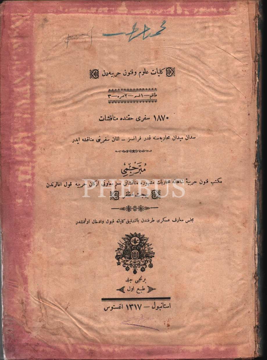 Külliyyât-ı Ulûm ve Fünûn-ı Harbiyyeden 1870 SEFERİ HAKKINDA MÜNÂKAŞÂT- 1. Cilt (Sedan Meydan Muhârebesi´ne Kadar Fransız-Alman Seferi Münâkaşası), çev. Behcet Muzaffer, Mekteb-i Fünun-ı Harbiye-i Şahane Matbaası, İstanbul 1317, 338 s., 20x27 cm
