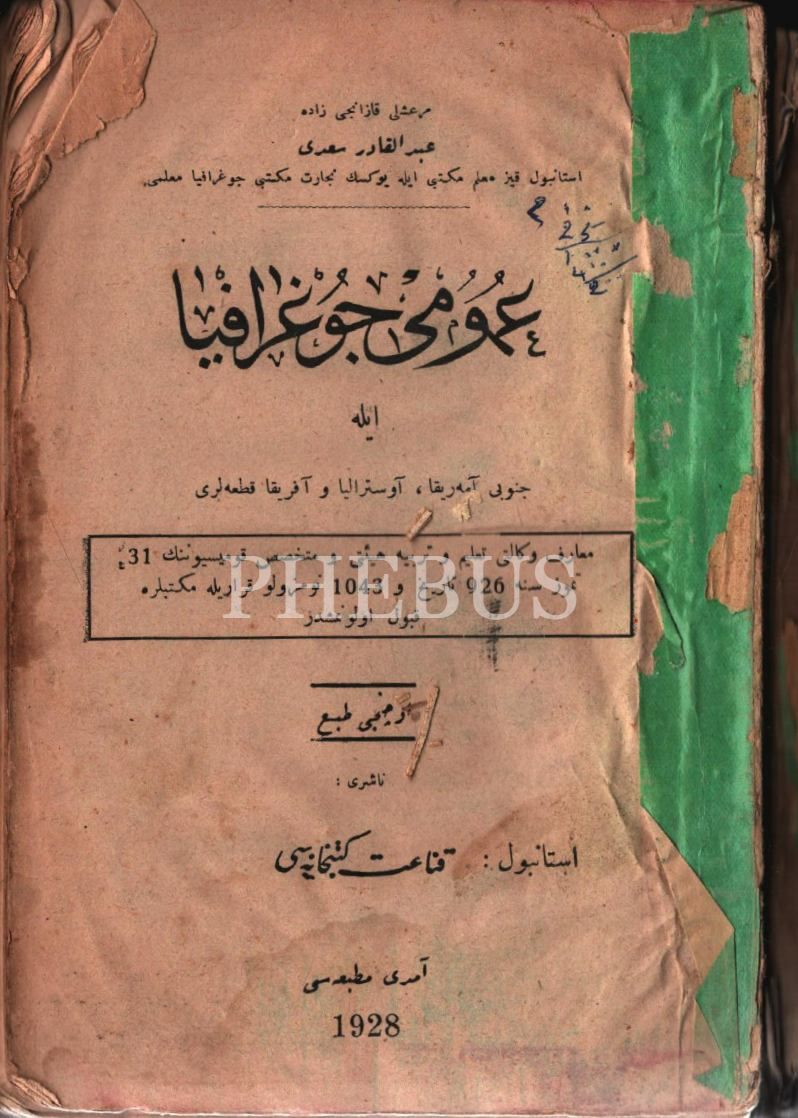 2 eser tek ciltte: UMÛMİ COĞRAFYA İLE CENÛBÎ AMERİKA [Güney Amerika], AVUSTRALYA VE AFRİKA KIT´ALARI, Abdulkadir Sa´dî, Amedi Matbaası, İstanbul 1928, 148+109+29 s.;