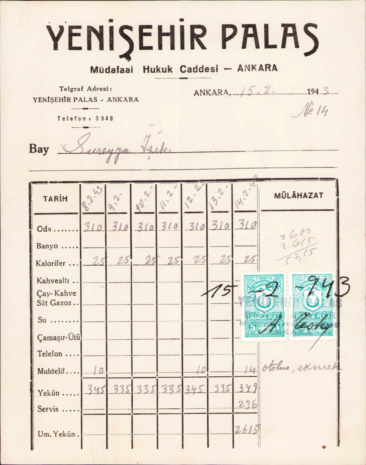 Ankara Yenişehir Palas 1943 tarihli fatura