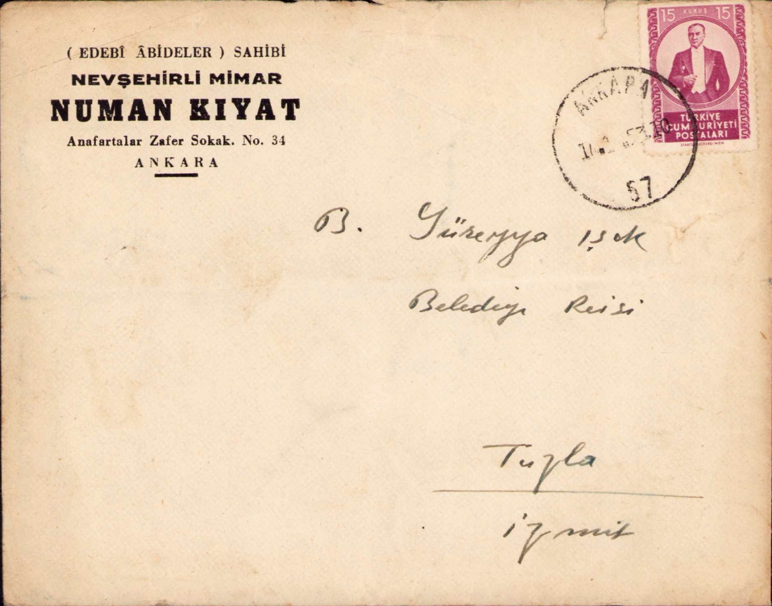 Nevşehirli Mimar Numan Kıyat antetli postadan geçmiş zarf
