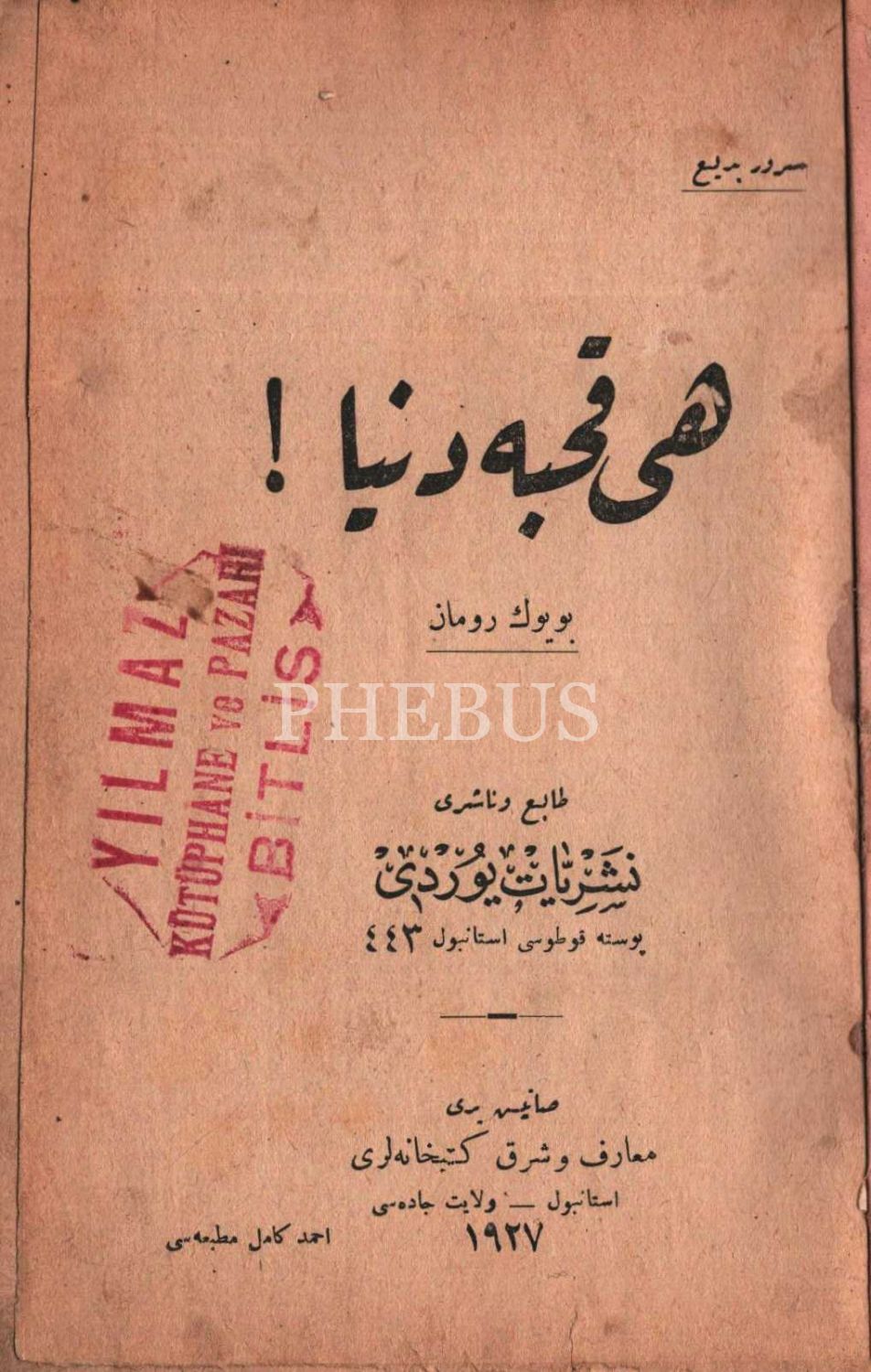 HEY KAHBE DÜNYA!, Server Bedî´ [Peyami Safa], Ahmed Kâmil Matbaası, İstanbul 1927, 196 s., 14x21 cm