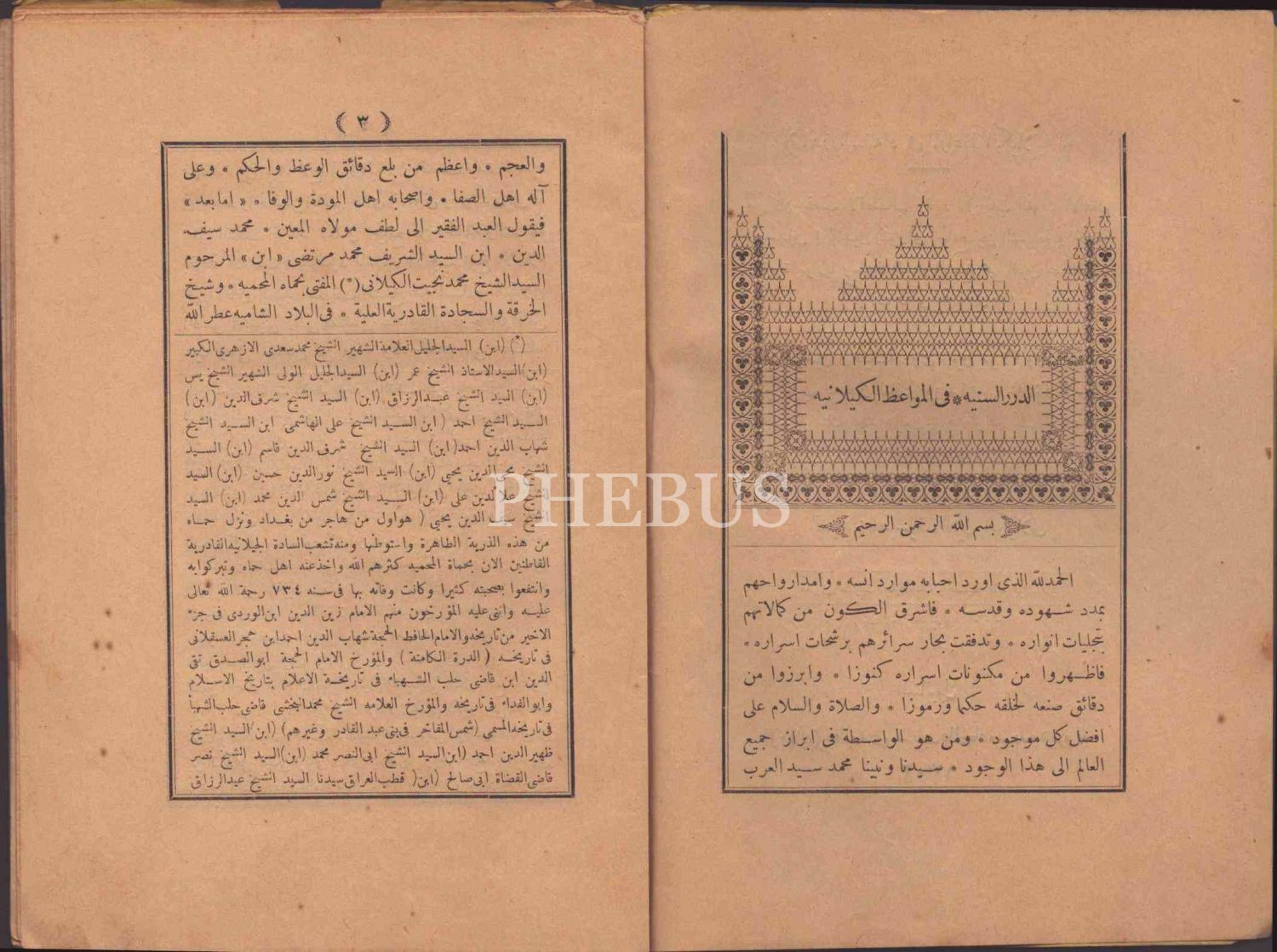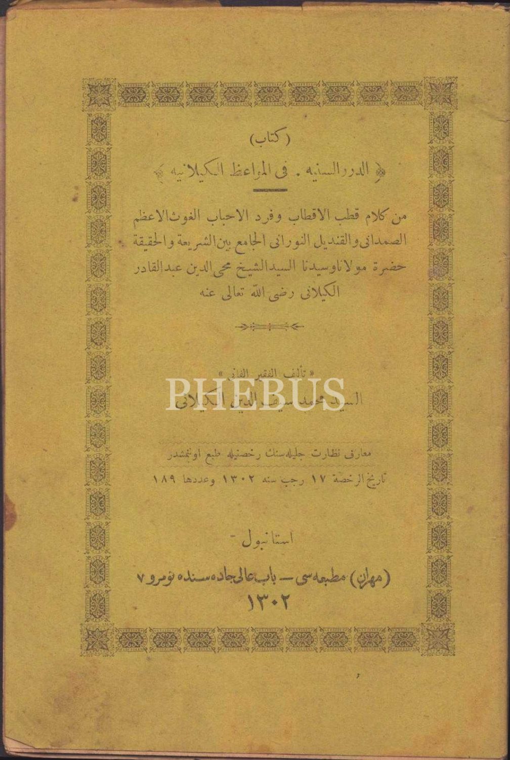 Arapça ED-DÜRERÜ´S-SENİYYE Fİ´L-MEVÂİZİ´L-GEYLÂNİYYE, Seyyid Mehmed Seyfeddin el-Geylânî, Mihran Matbaası, İstanbul 1302, 52 s., 14x20 cm