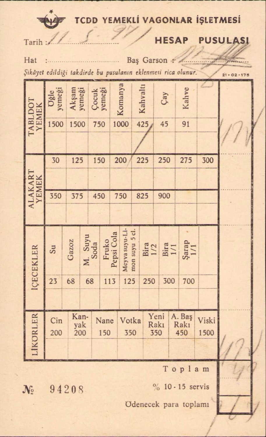 TCDD Yemekli Vagonlar İşletmesi hesap pusulası