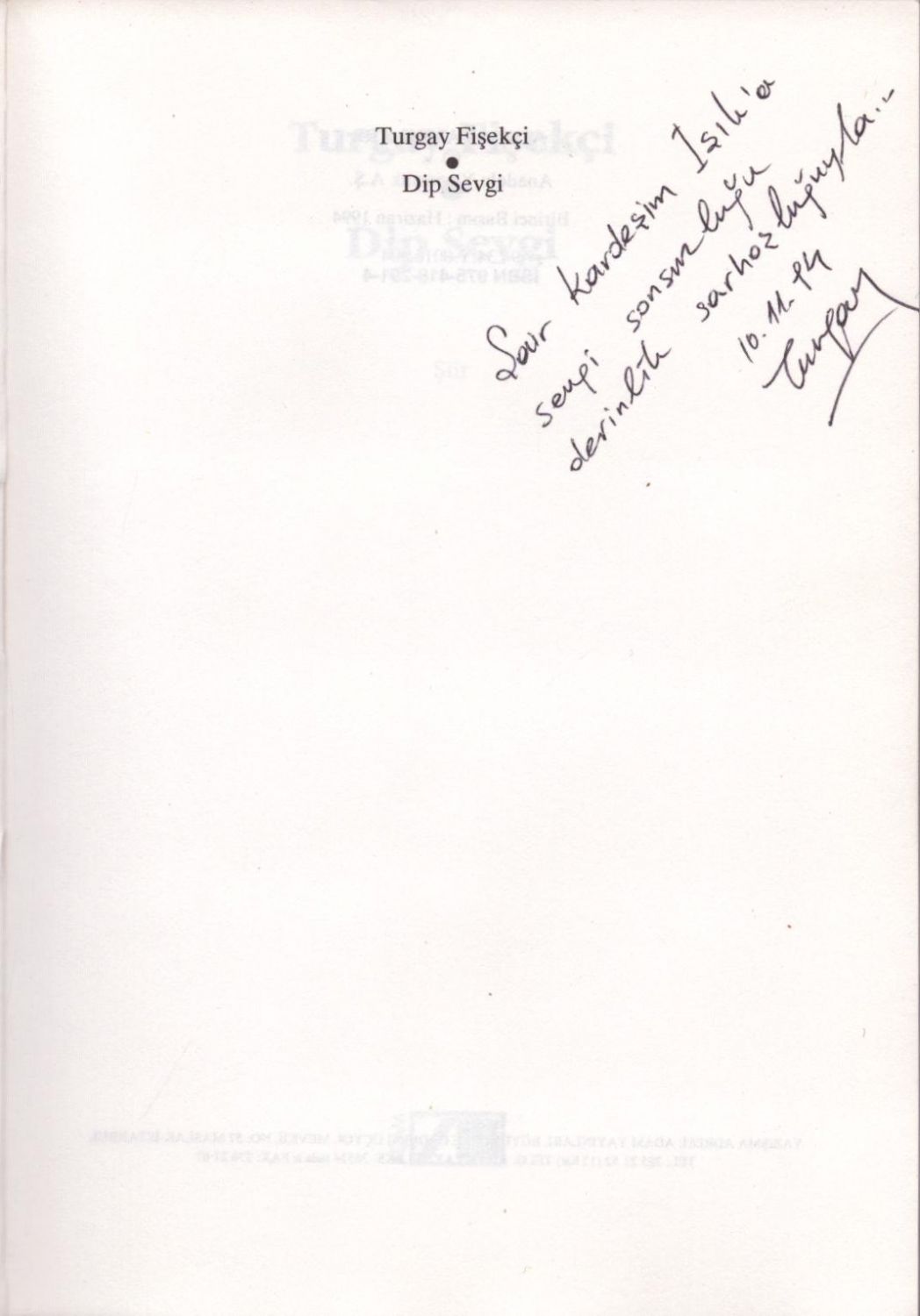 Turgay Fişekçi´den ithaflı ve imzalı DİP SEVGİ, Adam Yayınları, Haziran 1984, 61 sayfa, 14x20 cm