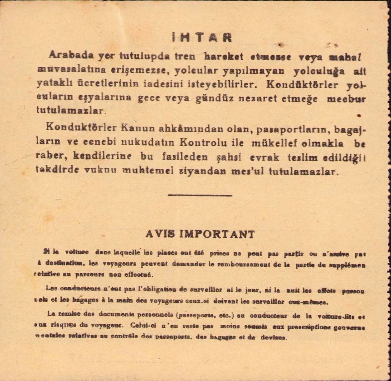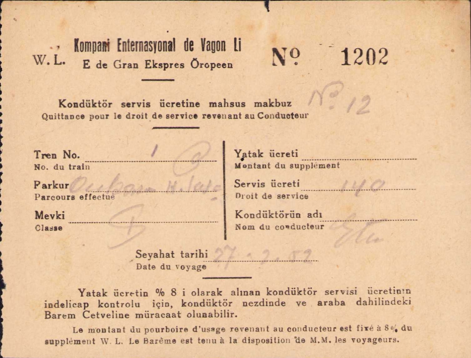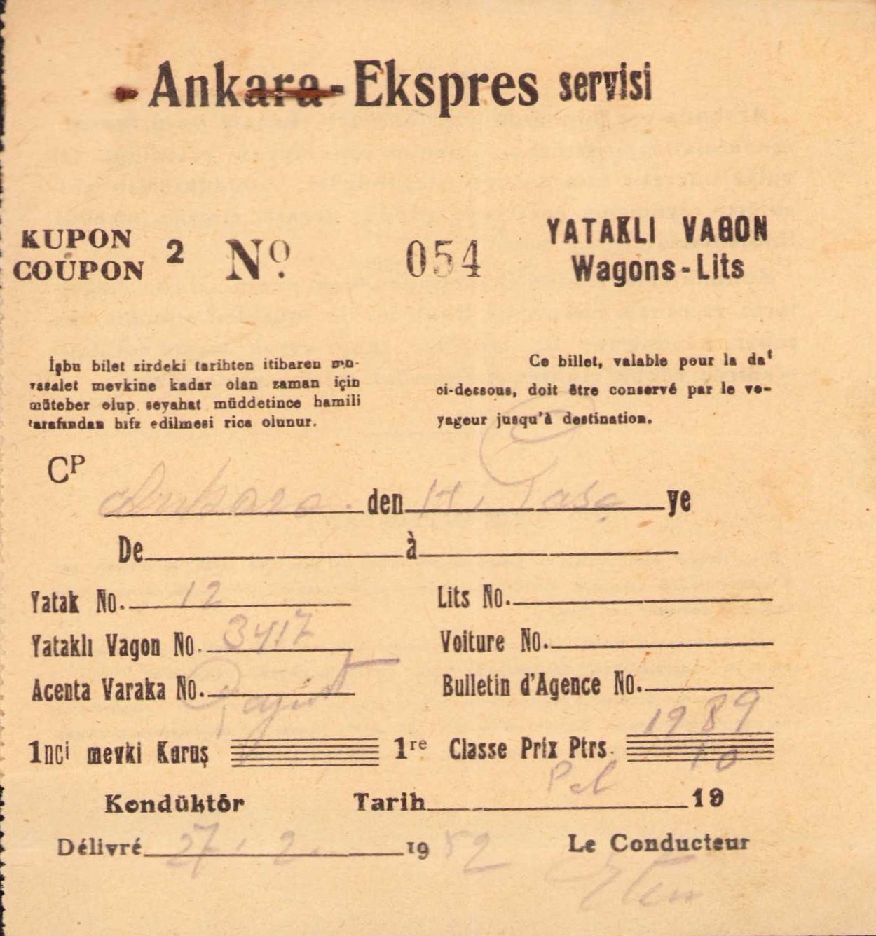 Ankara Wagons-Lits yataklı vagon kuponu