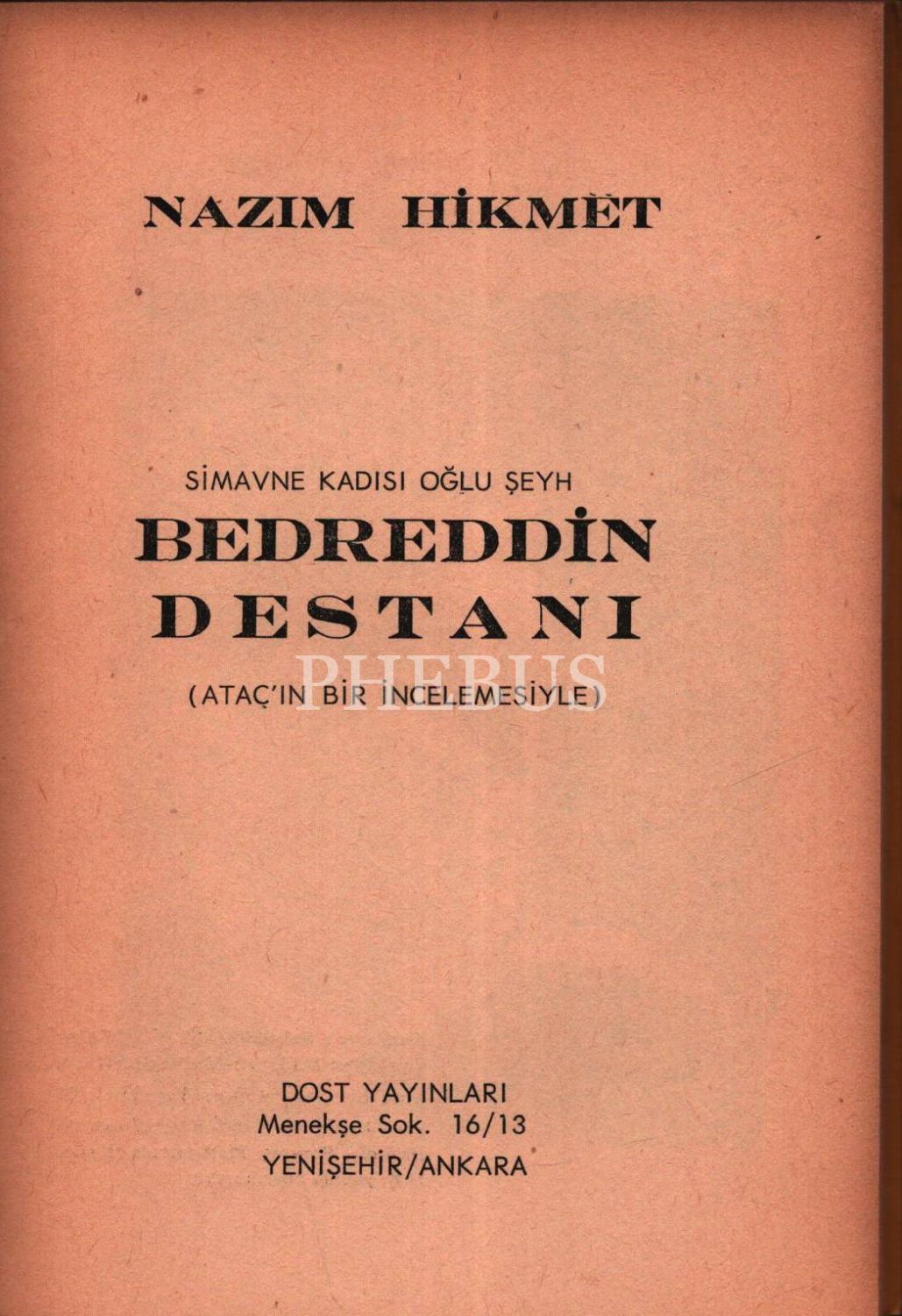 SİMAVNE KADISI OĞLU ŞEYH BEDREDDİN DESTANI (Ataç´ın Bir İncelemesiyle), Nazım Hikmet, Dost yayınları, Kasım 1968, 60 sayfa, 14x20 cm