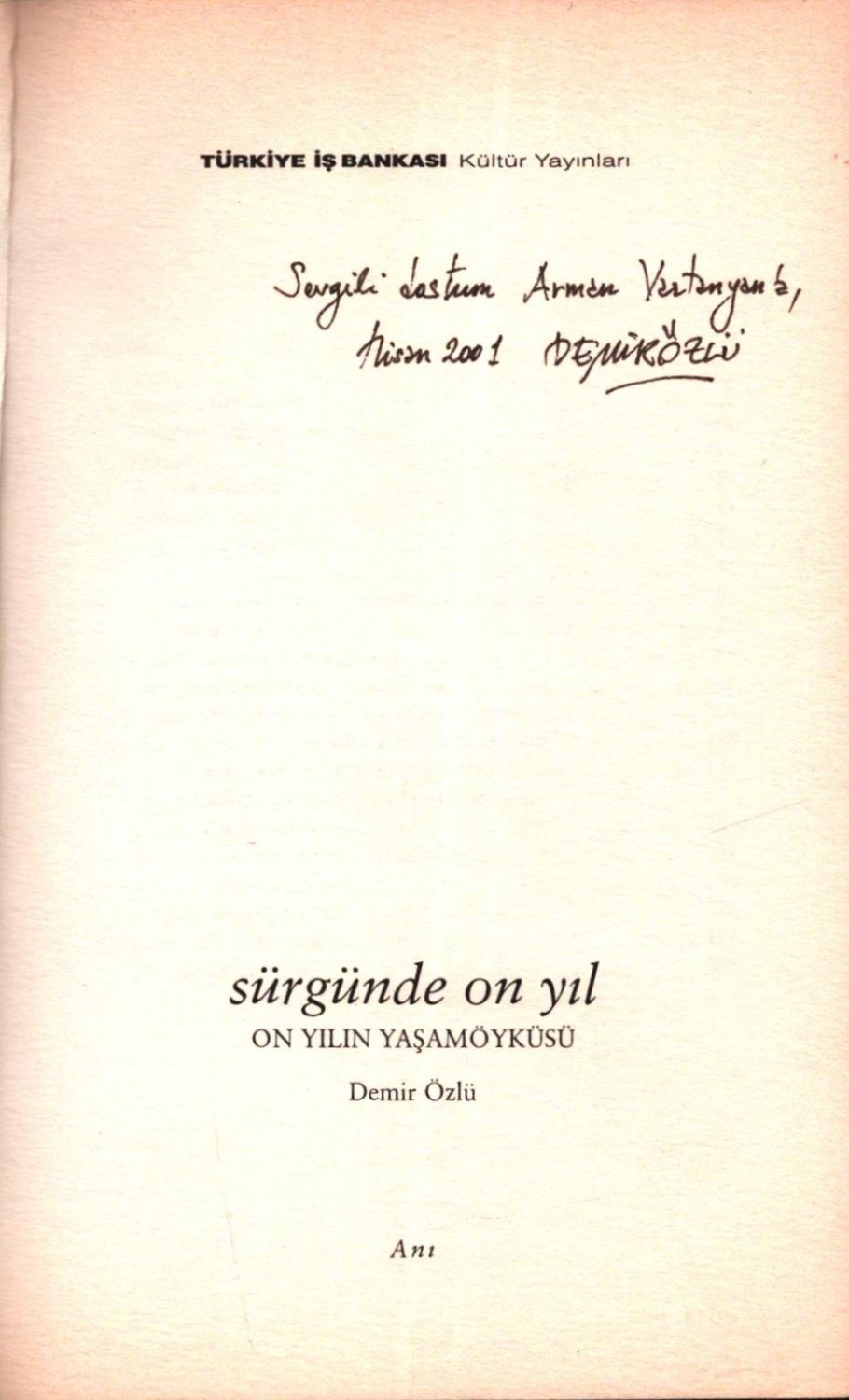 İthaf, "Sevgili dostum Armen Vartanyan´a, Nisan 2001 Demir Özlü" şeklindedir.