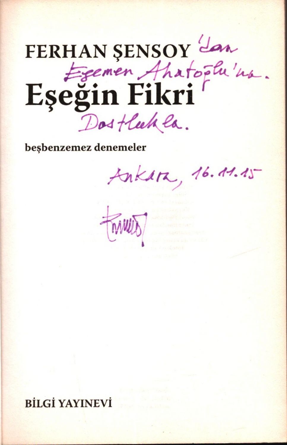 Ferhan Şensoy´dan ithaflı ve imzalı EŞEĞİN FİKRİ (Beşbenzemez Denemeler), Bilgi Yayınevi, Şubat 2015, 159 sayfa, 14x20 cm