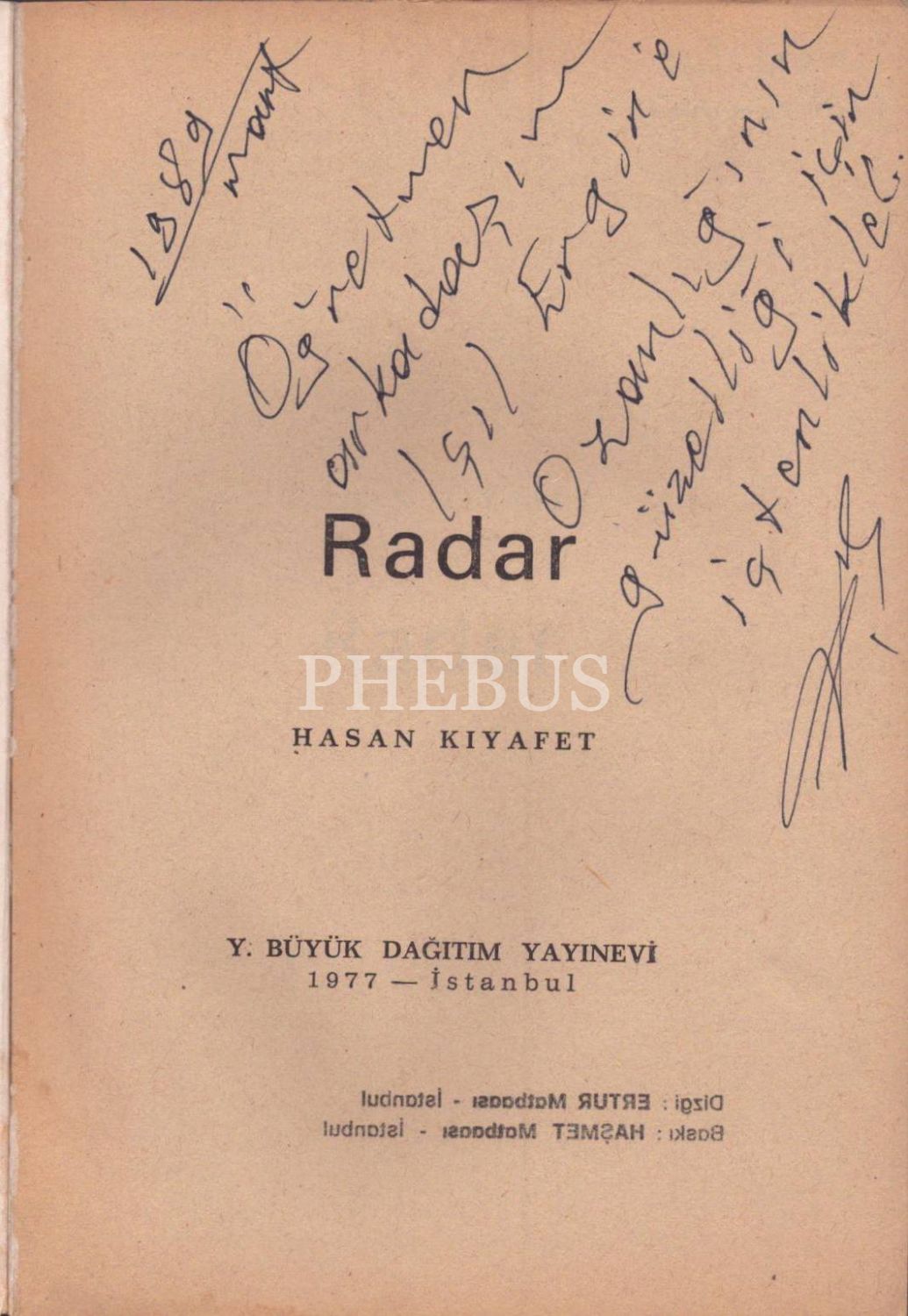 Hasan Kıyafet´ten ithaflı ve imzalı RADAR, Y. Büyük Dağıtım Yayınevi, İstanbul - 1977, 150 sayfa, 13x20 cm