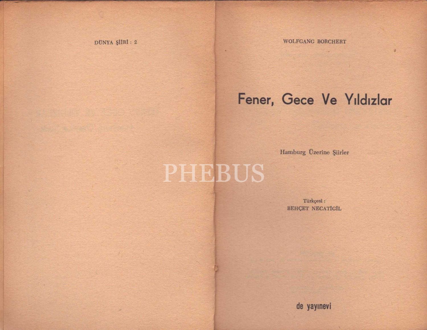 FENER, GECE VE YILDIZLAR (Hamburg Üzerine Şiirler), Wolfgang Borchert, Türkçesi: Behçet Necatigil, De Yayınevi, İstanbul - Mart 1963, 37 sayfa, 14x20 cm