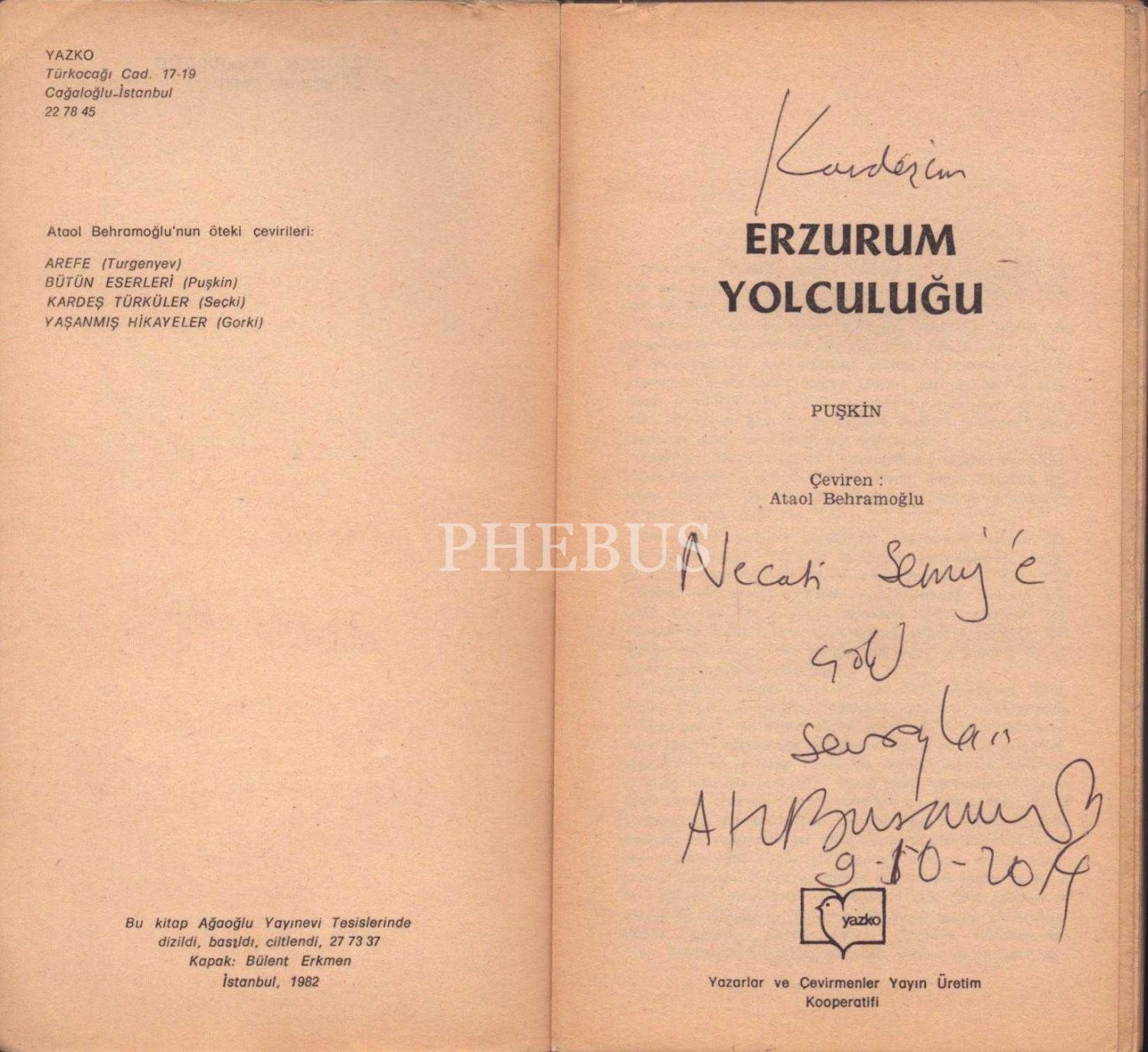 Çeviren Ataol Behramoğlu´dan ithaflı ve imzalı ERZURUM YOLCULUĞU, Puşkin, Yazko, İstanbul - 1982, 218 sayfa, 11x19 cm