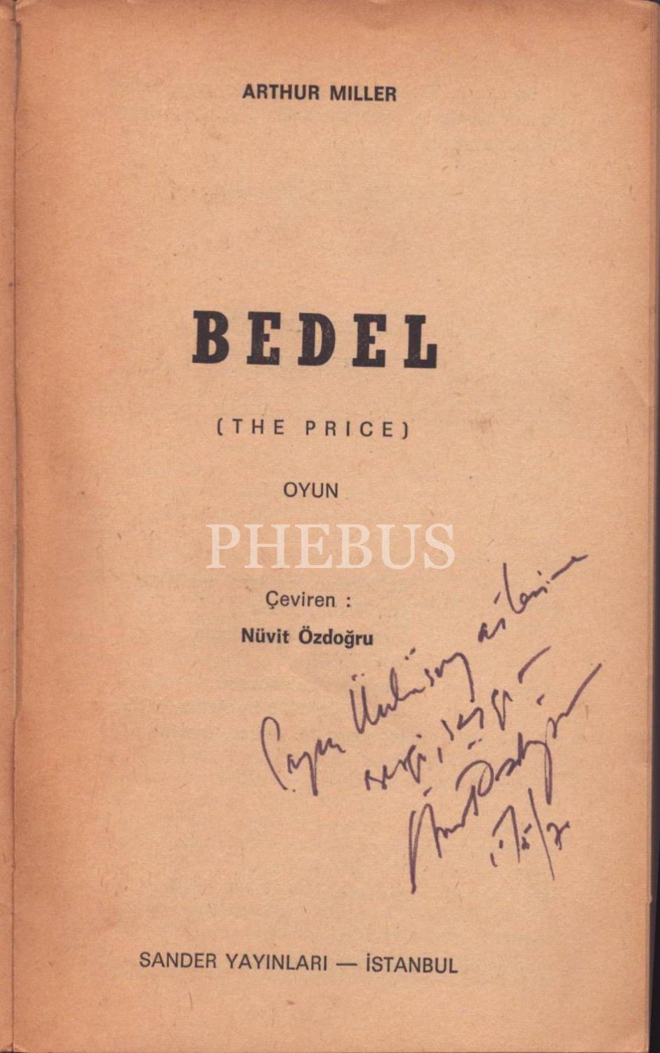 Çeviren Nüvit Özdoğru´dan ithaflı ve imzalı BEDEL (The Price), Arthur Miller, Sander Yayınları, İstanbul - Nisan 1970, 112 sayfa, 12x19 cm