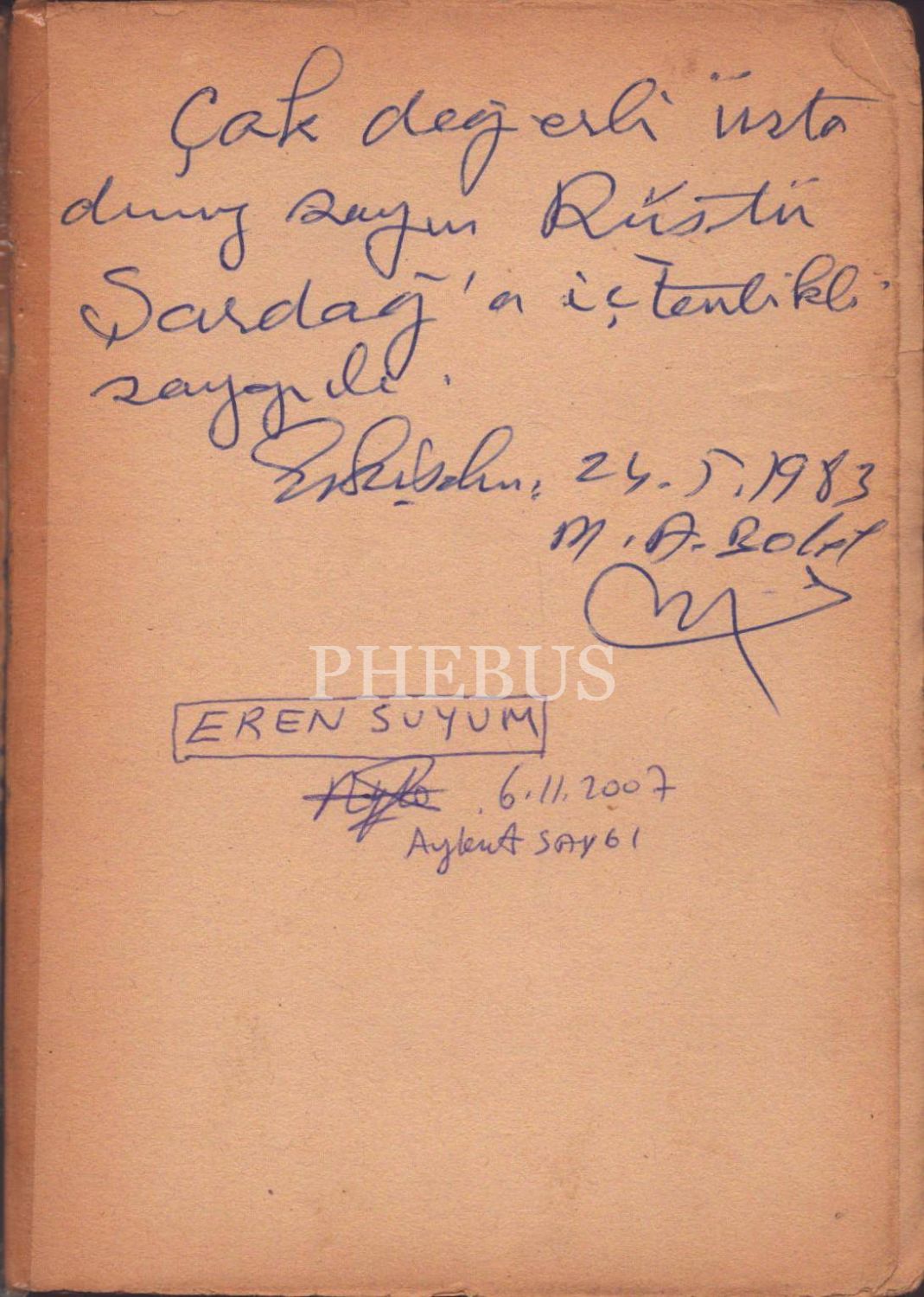 İthaf, "Çok değerli üstadımız Sayın Rüştü Şardağ´a içtenlik ve saygı ile. Eskişehir, 24.5.1983 M. A. Bolal" şeklindedir. Cilt ve metin yorgun haliyle.