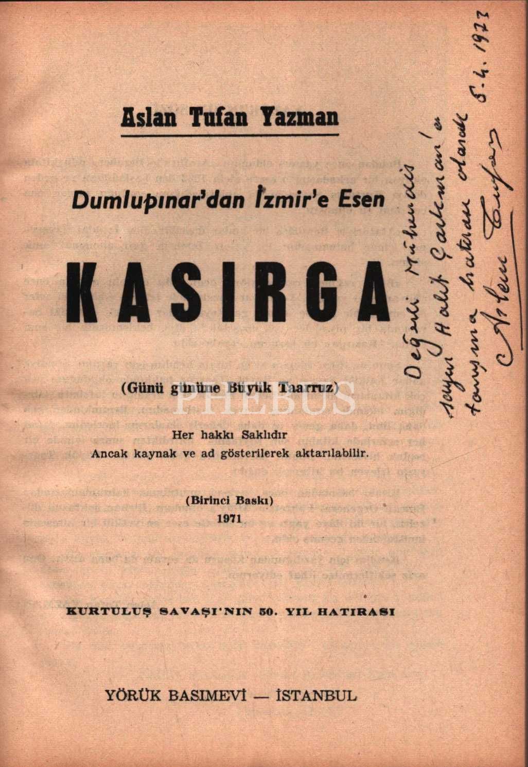 Aslan Tufan Yazman´dan ithaflı ve imzalı Dumlupınar´dan İzmir´e Esen KASIRGA (Günü Gününe Büyük Taarruz), Yörük Basımevi, İstanbul - 1971, 100 sayfa, 14x20 cm