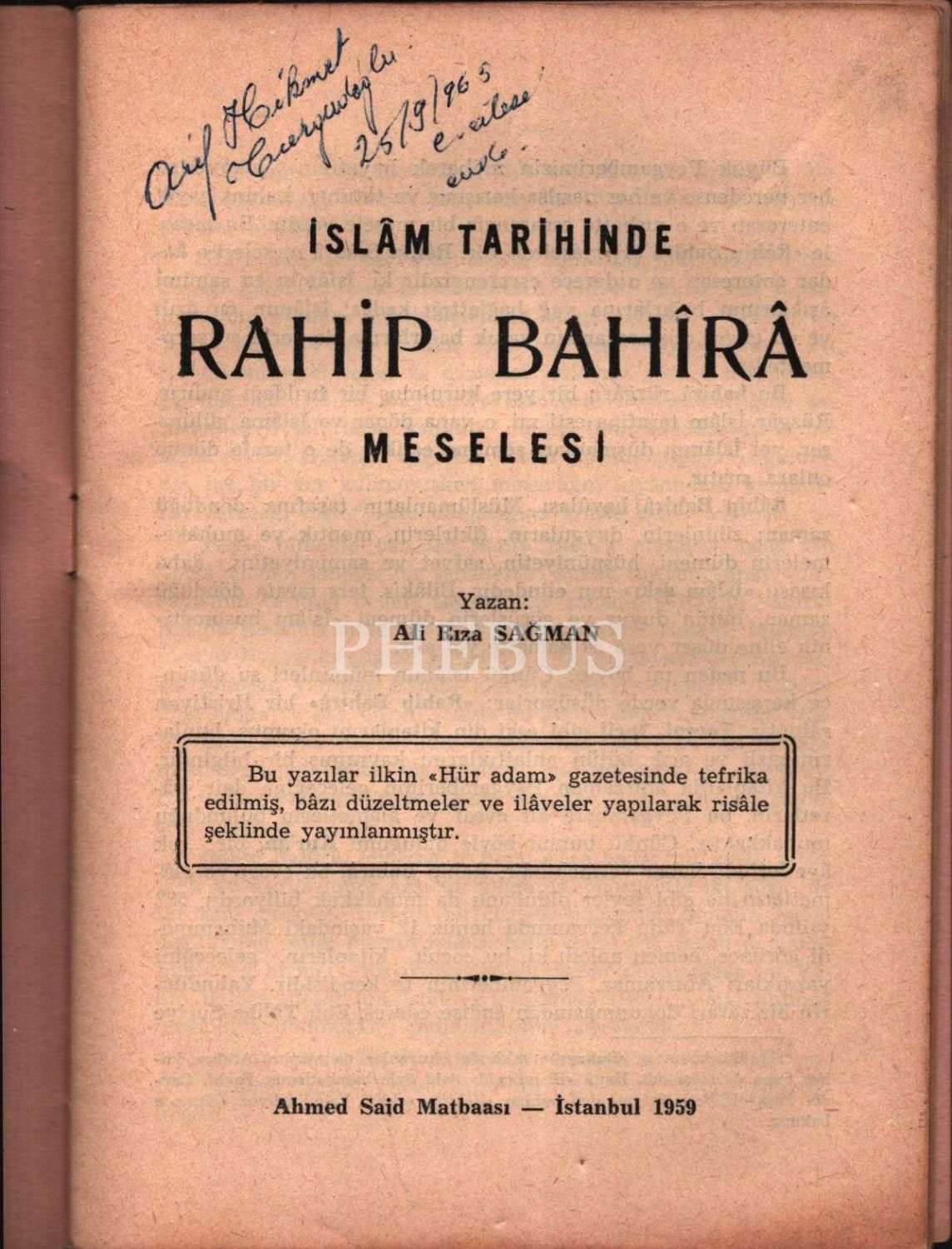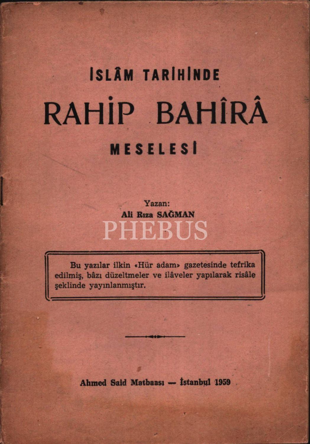 İSLÂM TARİHİNDE RAHİP BAHÎRÂ MESELESİ, Ali Rıza Sağman, Ahmed Said Matbaası, İstanbul - 1959, 32 sayfa, 14x20 cm