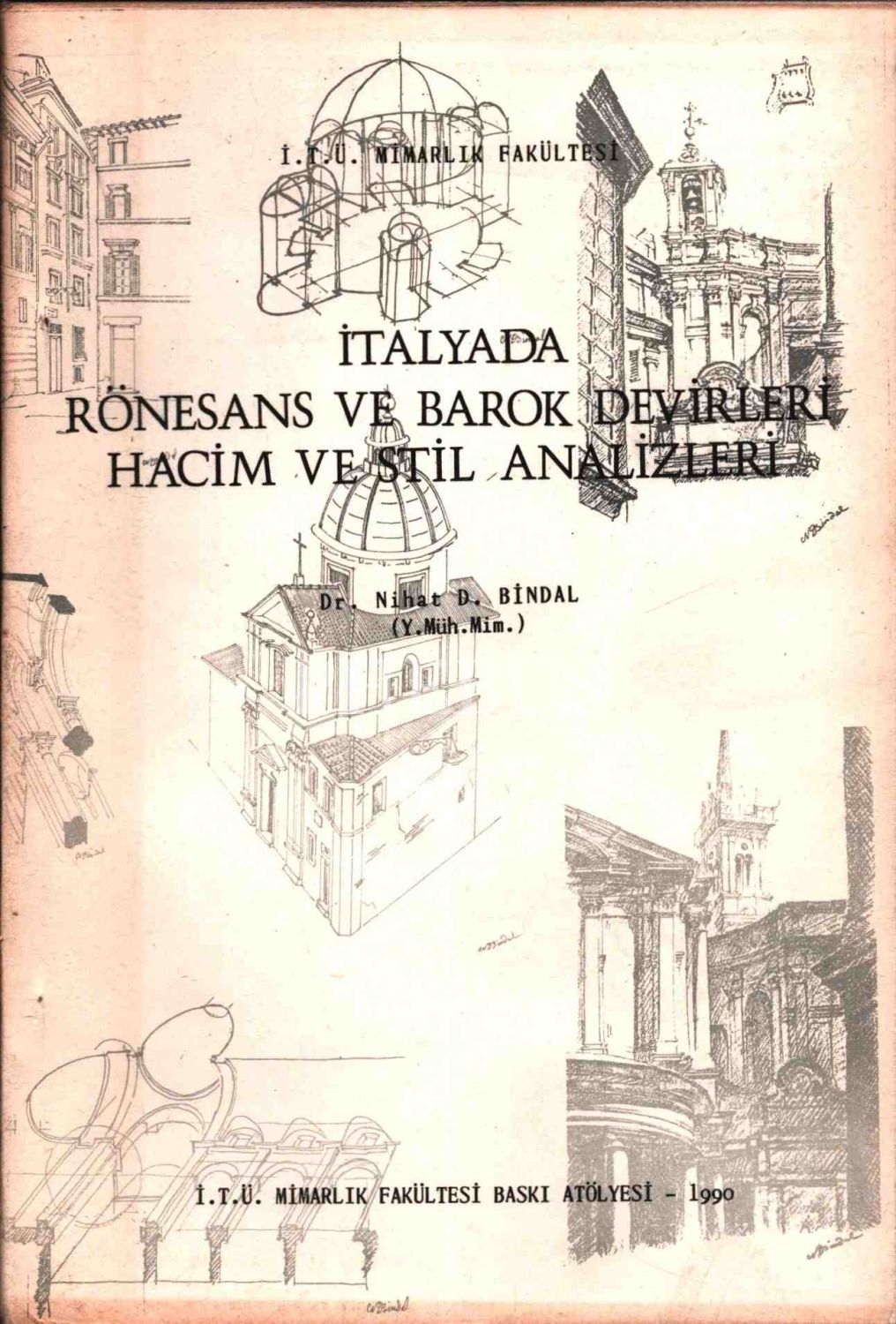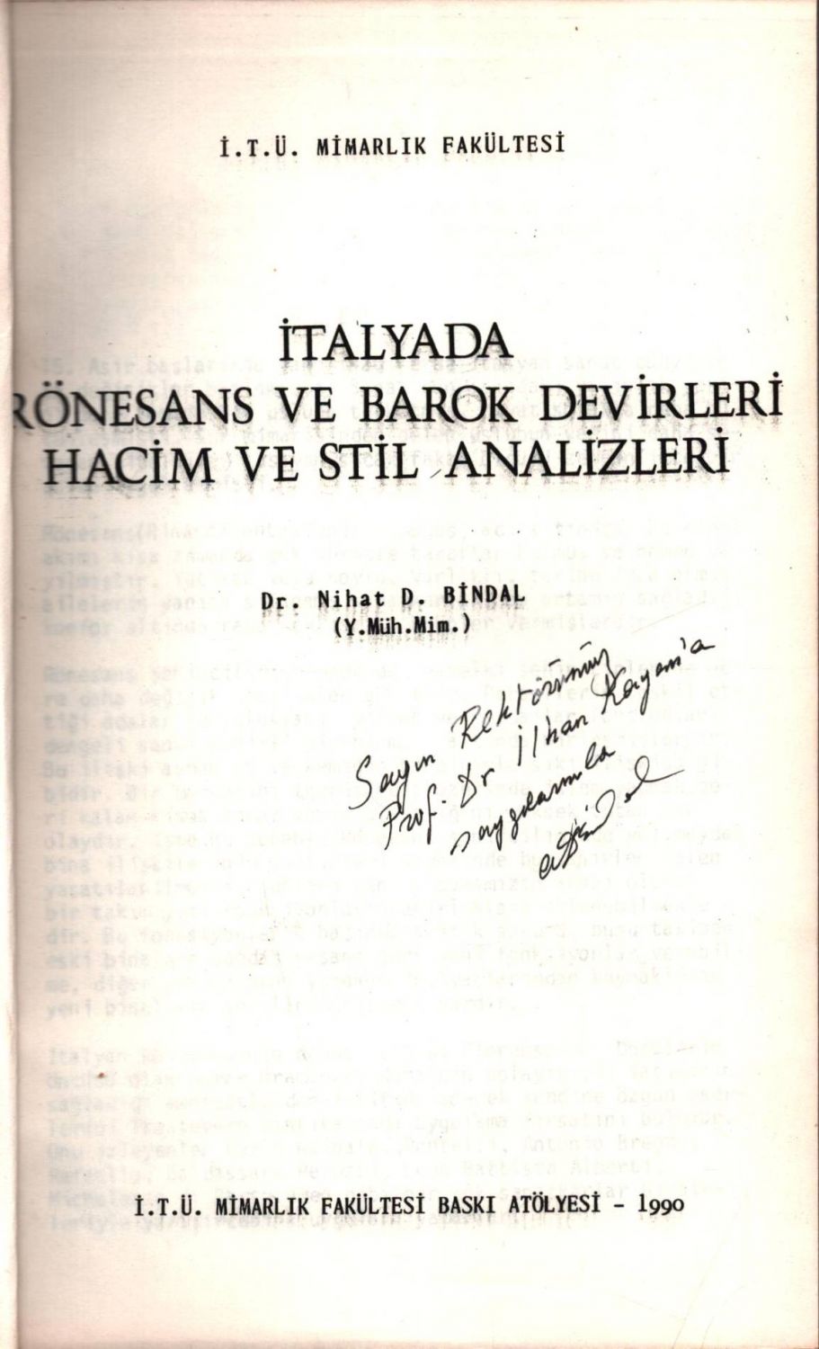Dr. Nihat B. Bindal´dan İlhan Kayan´a ithaflı ve imzalı İTALYADA RÖNESANS VE BAROK DEVİRLERİ HACİM VE STİL ANALİZLERİ, İ.T.Ü. Mimarlık Fakültesi Baskı Atölyesi, 1990, 149 sayfa, 16x24 cm