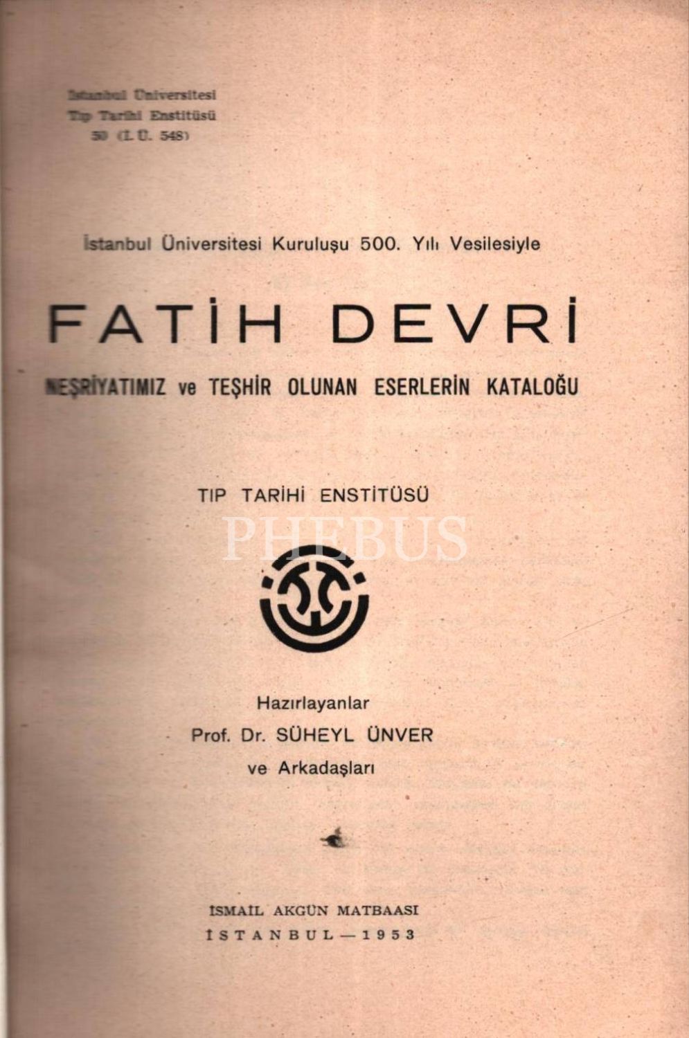 İstanbul Üniversitesi Kuruluşu 500. Yılı Vesilesiyle FATİH DEVRİ NEŞRİYATIMIZ VE TEŞHİR OLUNAN ESERLERİN KATALOĞU, Süheyl Ünver ve Arkadaşları, İsmail Akgün Matbaası, İstanbul - 1953, 24 sayfa, 14x20 cm