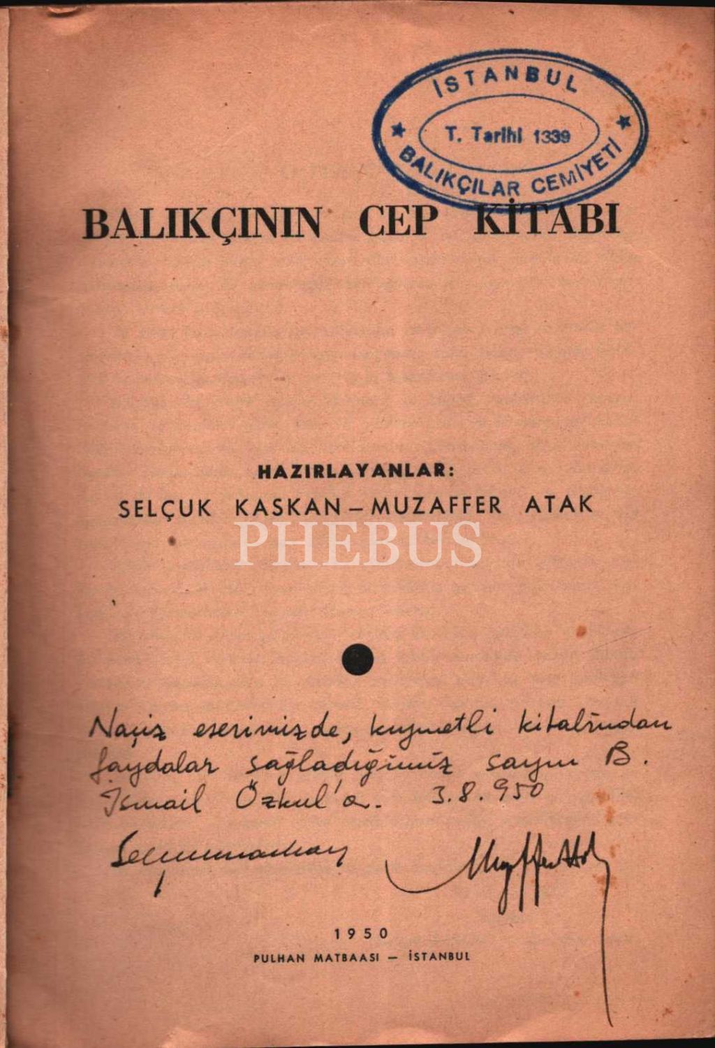 Hazırlayan Selçuk Kaskan ve Muzaffer Atak´tan ithaflı ve imzalı BALIKÇININ CEP KİTABI, Pulhan Matbaası, İstanbul - 1950, 150 sayfa, 14x20 cm