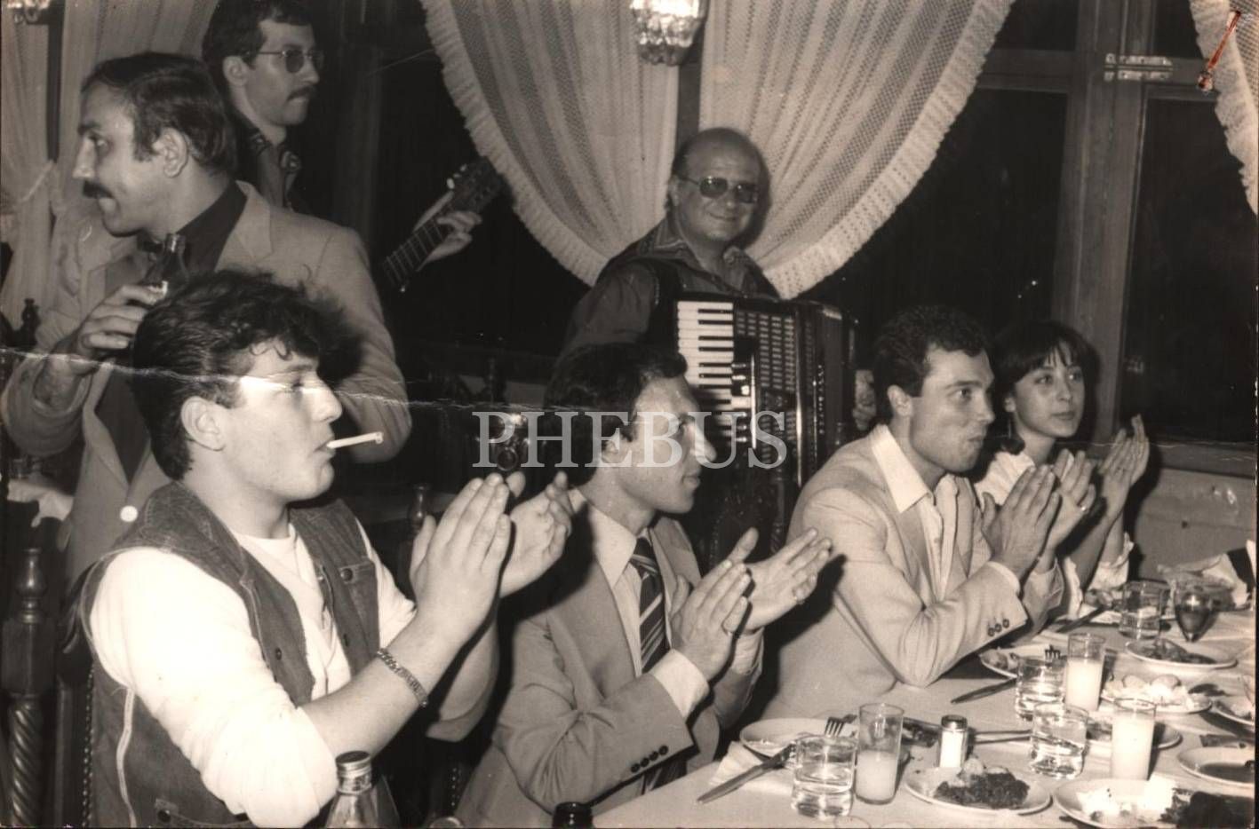 Müzikli bir eğlencede ritme alkış tutan arkadaş grubu, 18x12 cm