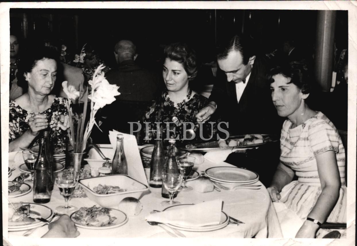 Lüks bir gazinoda üç hanımefendi ve kendilerine hizmet eden garson, arka yüzü "Photo M/V Karadeniz / Yılmaz Aytekin / 23 Temmuz 1963" damgalı, 18x11 cm