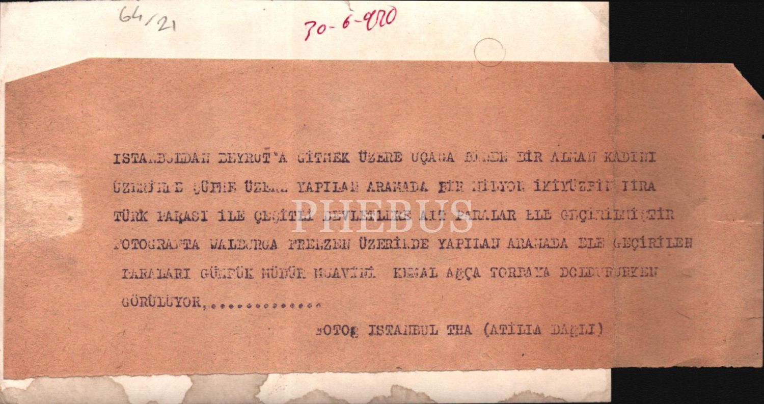 "İstanbuldan Beyrut´a gitmek üzere uçağa binen bir Alman kadını üzerinde ? ? yapılan aramada bir milyon ikiyüzbin lira Türk parası ile çeşitli devletlere ait paralar ele geçirilmiştir. Fotoğrafta Walburga Frenzen üzerinde yapılan aramada ele geçirilen paraları Gümrük Müdür Muavini Kemal Ağça torbaya doldururken görülüyor... Foto İstanbul THA (Atilla Dağlı)"
